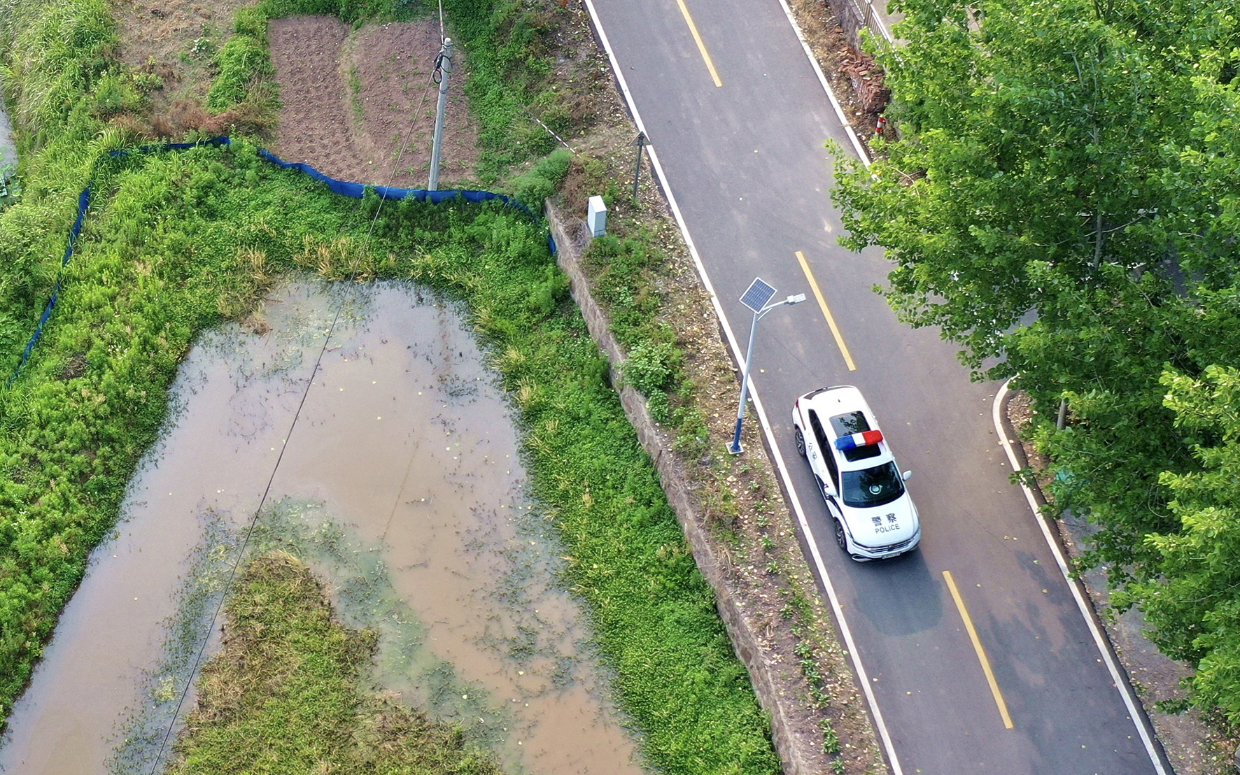 圖一、警車在美麗的村間公路上巡邏守護(hù)。