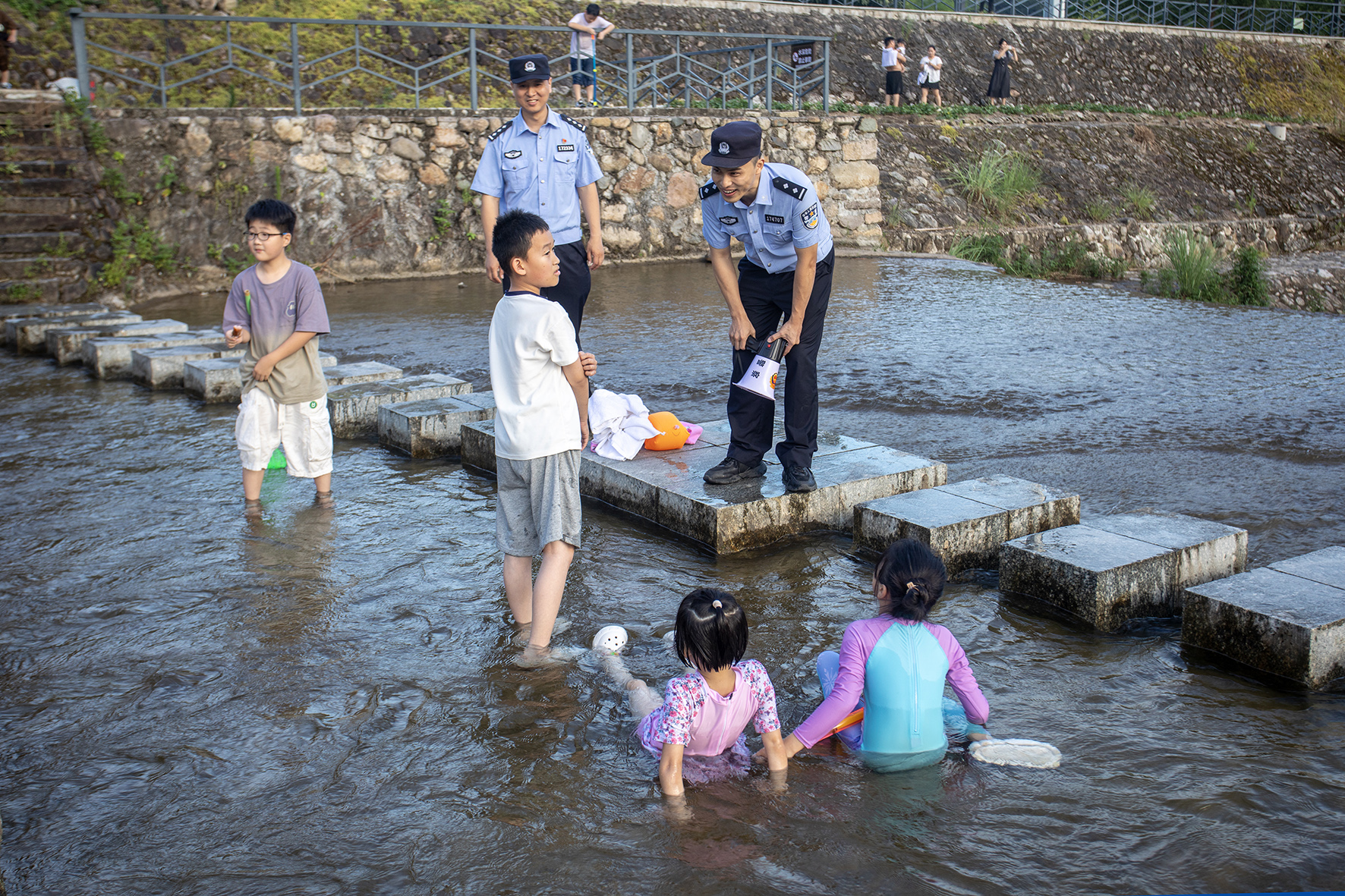 7月8日傍晚,浙江省臺(tái)州市公安局寧溪派出所民警在嶼頭鄉(xiāng)柔極溪開展防溺水巡查勸導(dǎo),對(duì)戲水的小朋友開展防溺水安全教育。