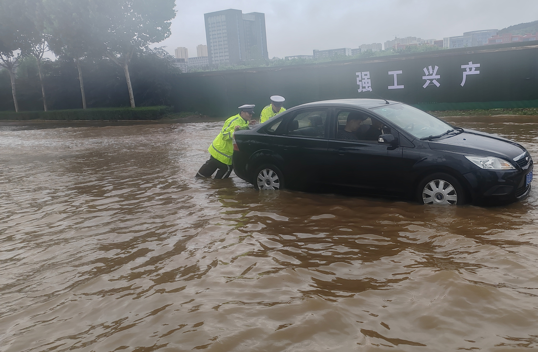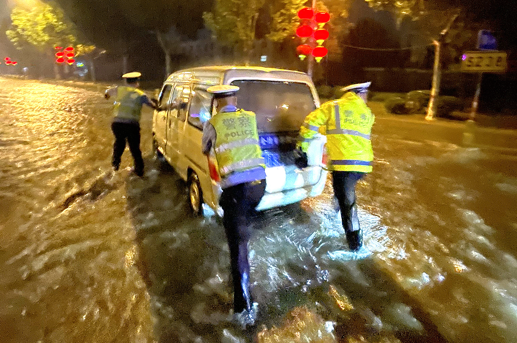 7月8日,山東省棗莊市公安局高新交警大隊民輔警在轄區(qū)積水嚴(yán)重路段幫助被困車輛脫險。