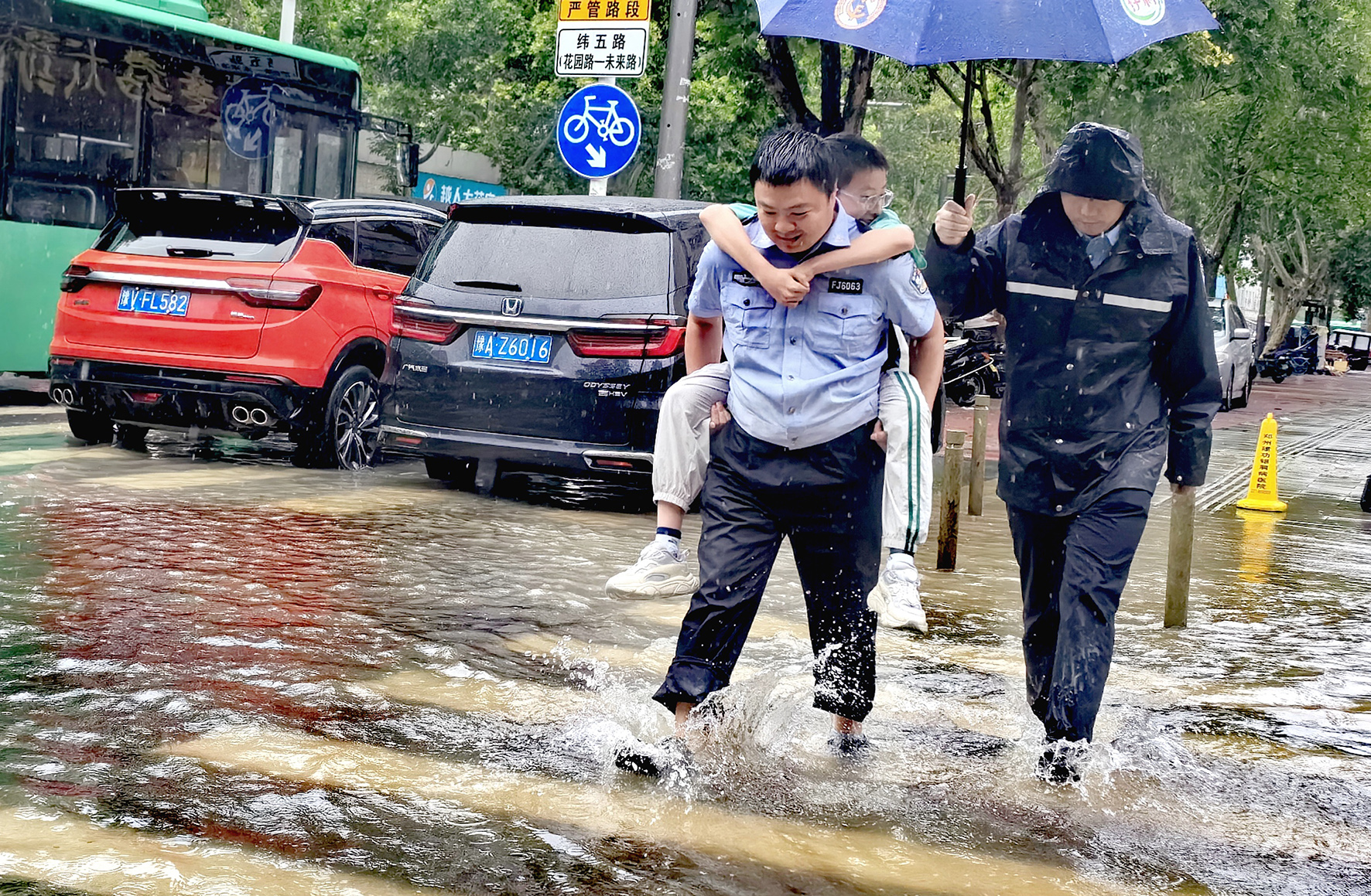 7月8日,河南省鄭州市公安局金水分局巡特警隊員在大雨中幫助小朋友經(jīng)過積水地段。