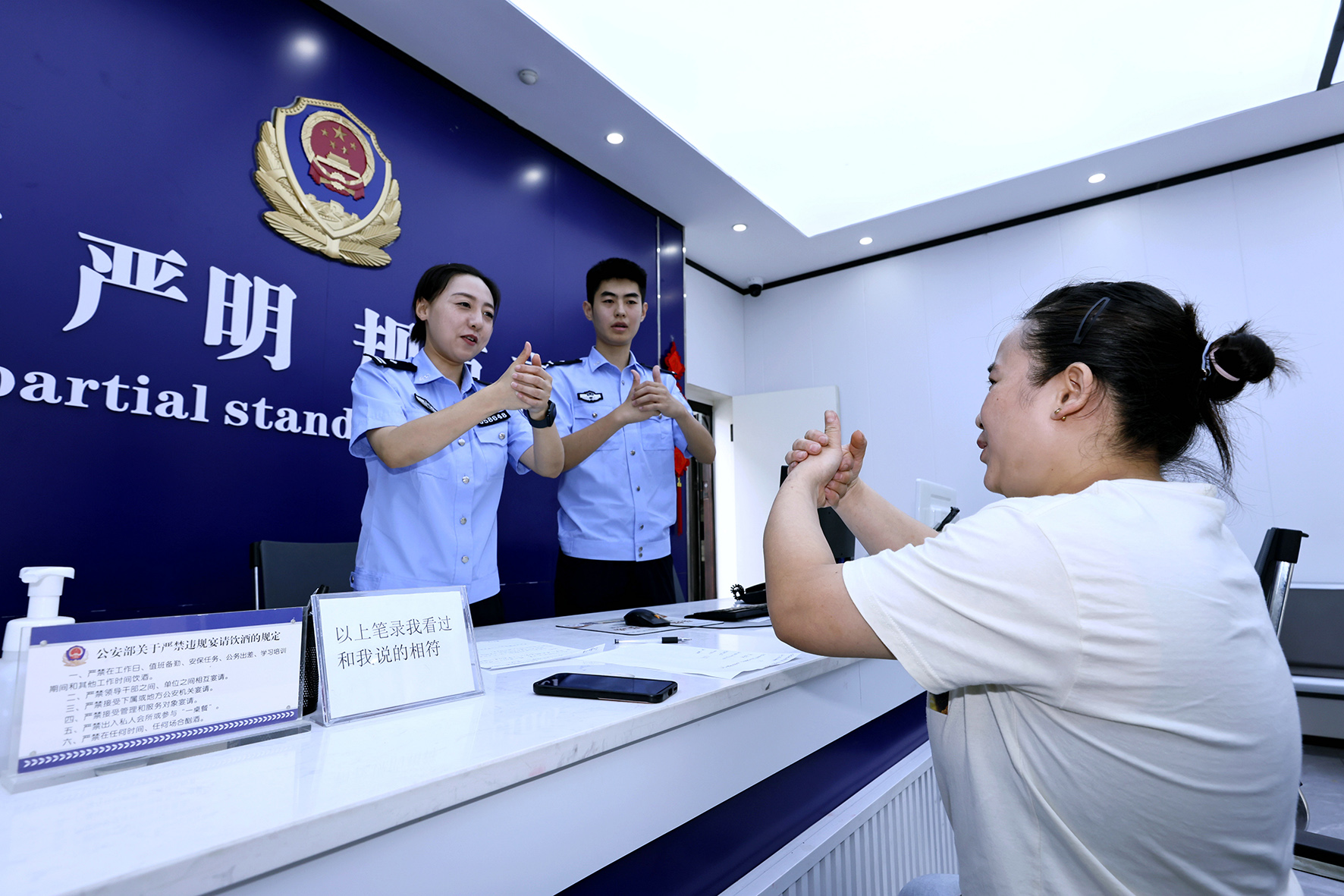 7月15日,在安徽省寧國市公安局刑偵大隊,一名患有聽力與語言障礙的受騙群眾收到民警追回的萬余元損失時用手語表示感謝。