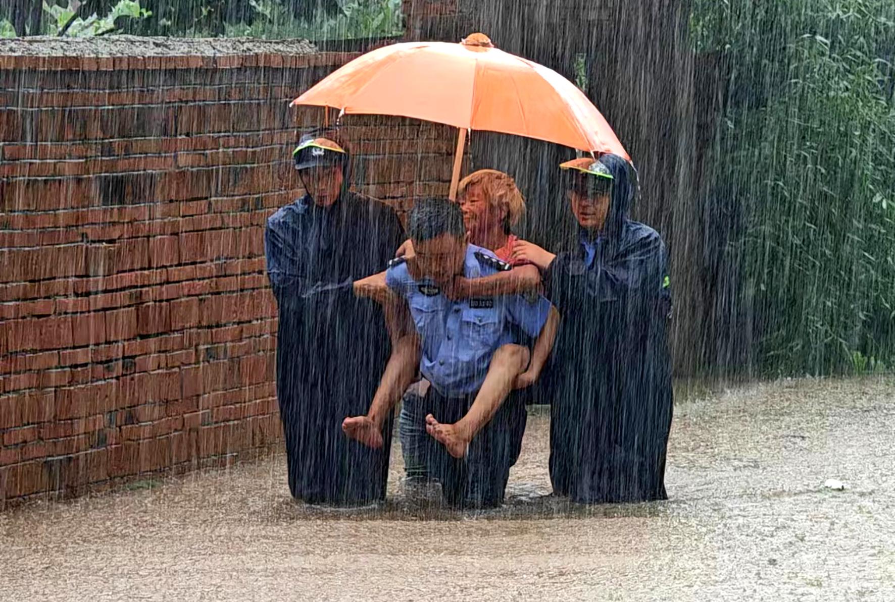 7月17日,安徽省亳州市公安局譙城分局顏集派出所民警迎著暴雨,將被困在家中的老人營救到安全區(qū)域,并妥善安置。