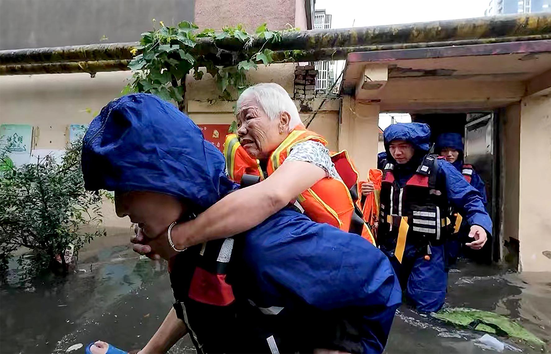 圖為7月17日,消防救援人員正在緊急轉移被困群眾。