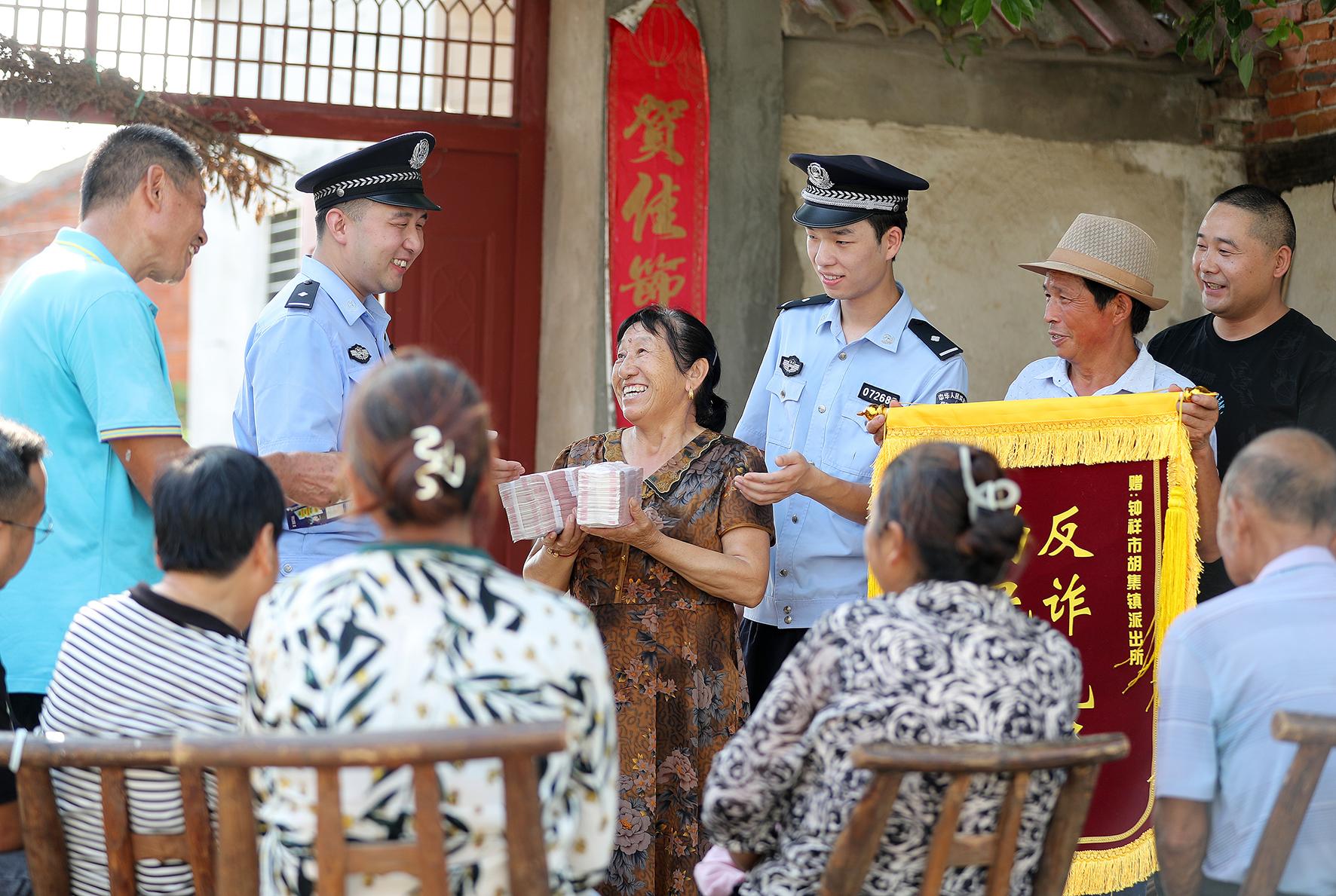 圖為8月22日,鐘祥市公安局胡集派出所民警在胡集鎮(zhèn)麗陽村,上門退還電信詐騙受害人20萬元被騙款,并陪同受害人“現(xiàn)身說法”,向村民講述被騙經(jīng)歷,讓村民識破電信詐騙伎倆,遠離電信詐騙。