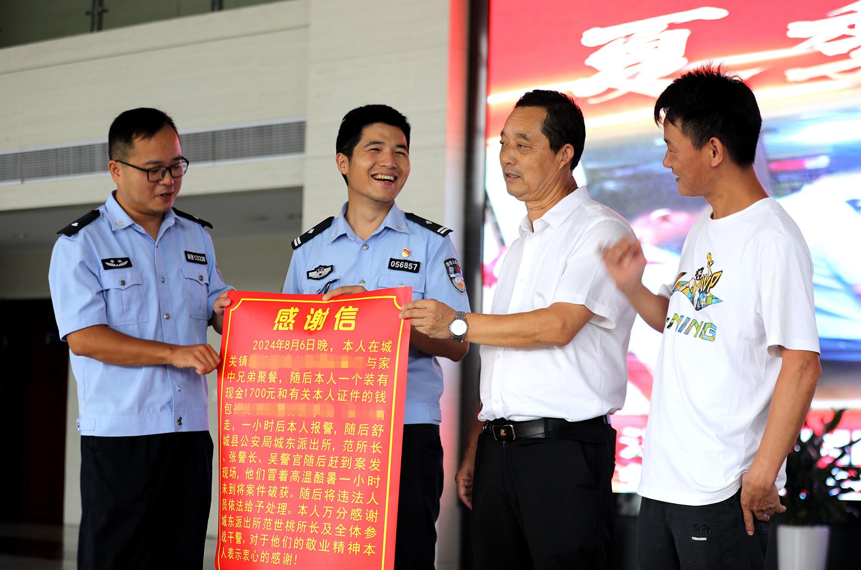 “我要把這封‘走心’的感謝信,送給‘用心’的警官們!”9月3日,家住安徽省舒城縣城關鎮(zhèn)的周先生手持“超大號”感謝信來到舒城縣公安局城東派出所,感謝民警快速破案并幫其找回財物。