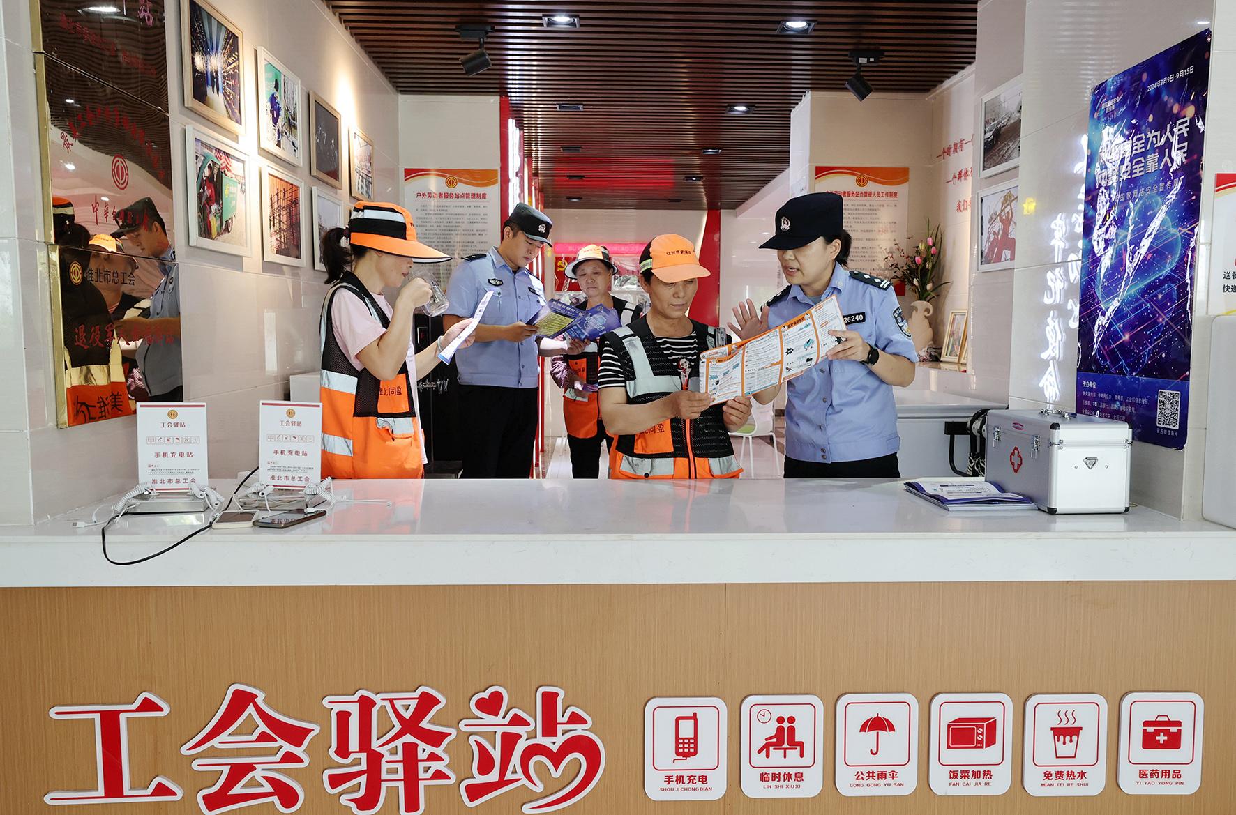 9月4日,安徽省淮北市公安局相山分局三堤口派出所民警在工會驛站里,向休息的戶外勞動者宣傳網(wǎng)絡(luò)安全知識。