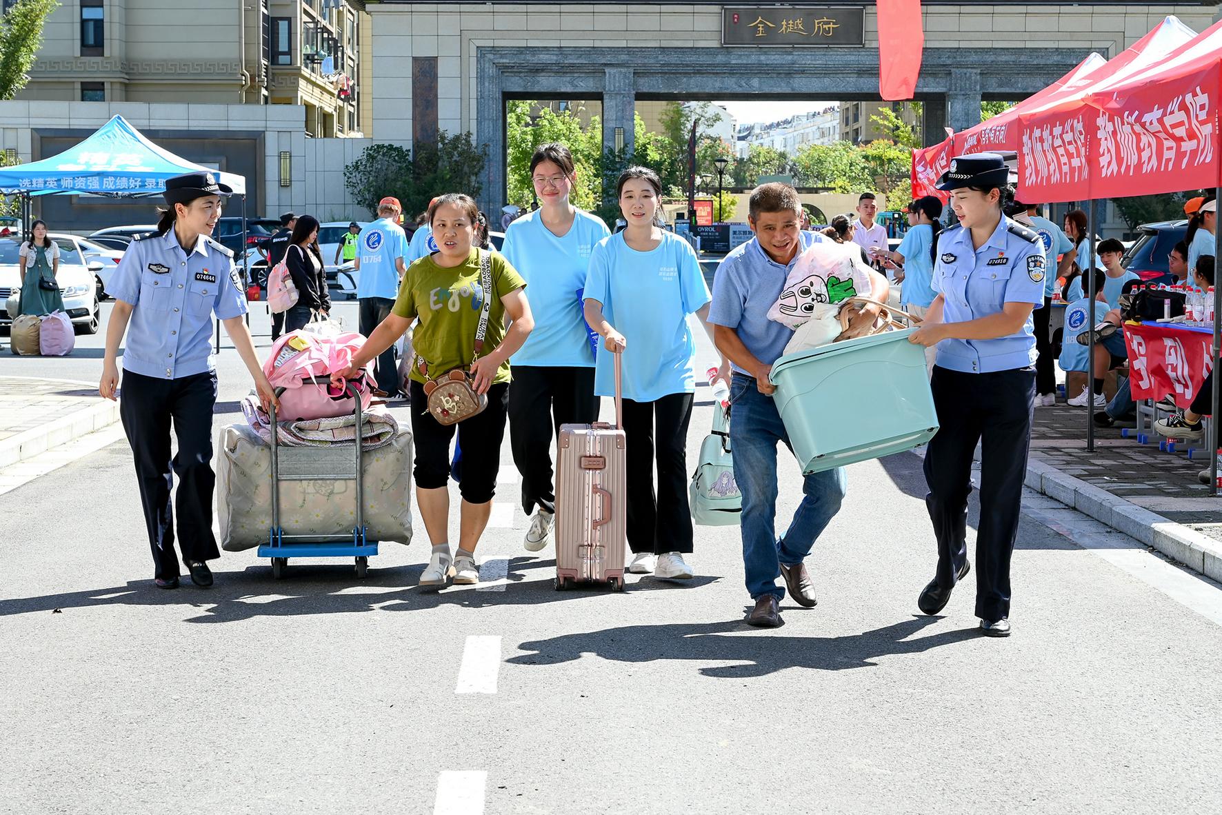 9月18日,在安徽省馬鞍山師范高等??茖W(xué)校,和縣公安局歷陽派出所民警正在幫助大一新生搬運(yùn)行李,并對(duì)新生及家長開展反詐、禁毒普法宣傳。
