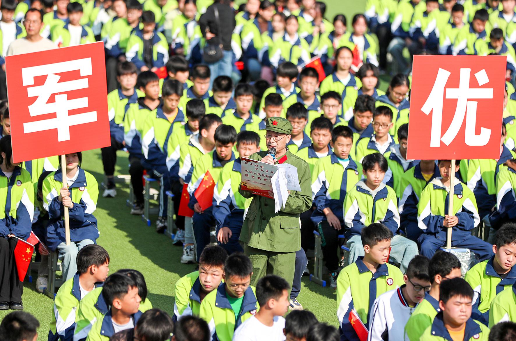 圖為10月15日,在華鎣二中國(guó)防教育法宣傳活動(dòng)現(xiàn)場(chǎng),戰(zhàn)斗英雄張昌仁向?qū)W生們講述自己保家衛(wèi)國(guó)的戰(zhàn)斗故事。