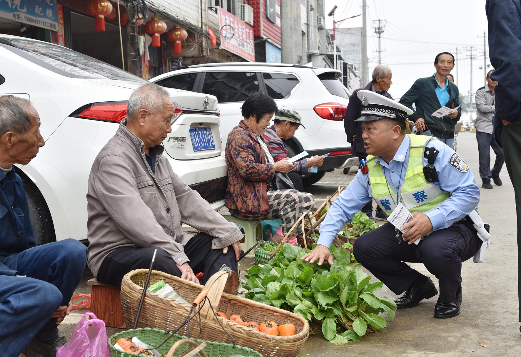 10月15日,安徽省宿松縣公安局交警大隊民輔警深入農(nóng)村集鎮(zhèn),對二郎街路邊擺攤的菜農(nóng)和商戶開展交通安全宣傳,提示擺攤時切勿占道影響交通通行和安全,并做好安全防護(hù)。