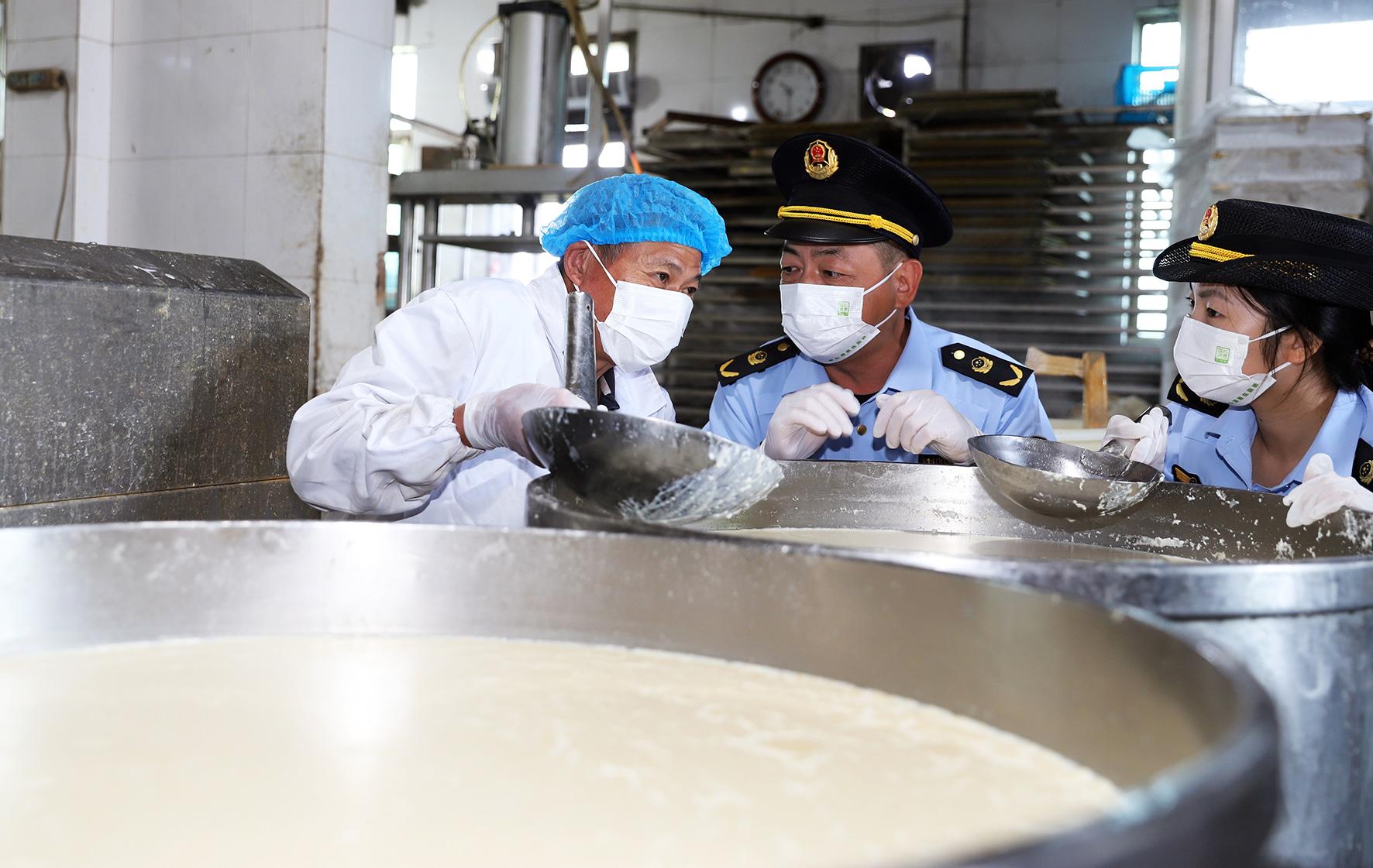 10月23日,浙江省臺(tái)州市路橋區(qū)橫街鎮(zhèn)市場(chǎng)監(jiān)督管理所執(zhí)法人員在一家豆腐生產(chǎn)作坊檢查食品安全,向從業(yè)人員宣傳食品安全的相關(guān)法律法規(guī)。