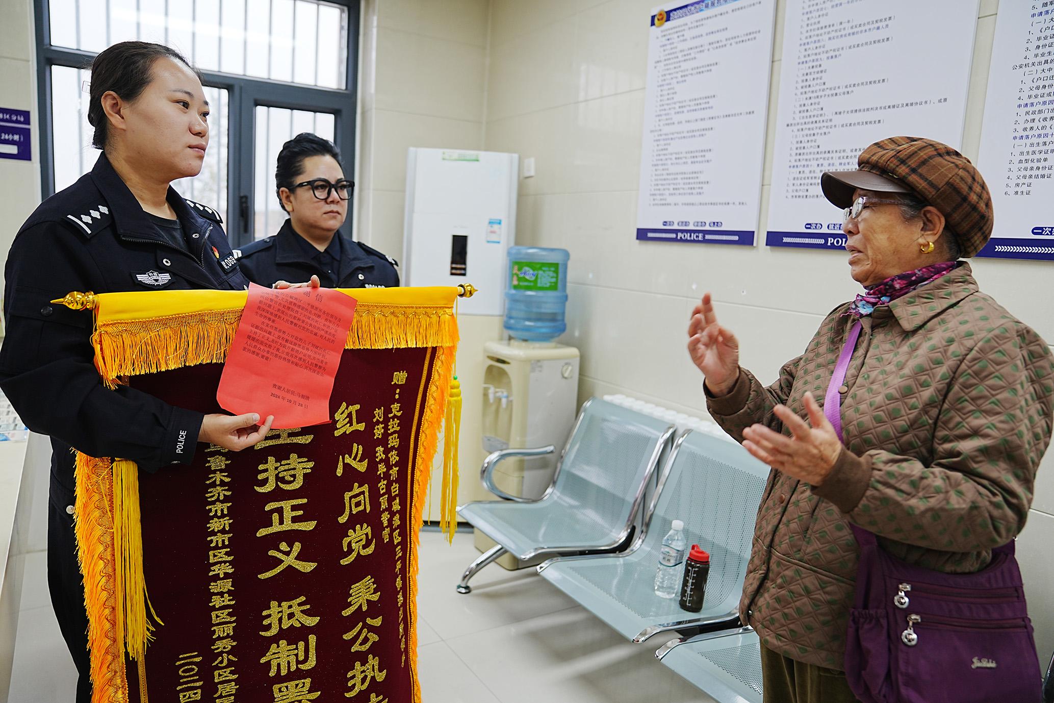 10月29日,新疆維吾爾自治區(qū)烏魯木齊市馬女士跨越300公里專程來到克拉瑪依市公安局三平鎮(zhèn)派出所,將一面錦旗贈(zèng)給民警,感謝民警幫助其解決了兒子長期沒有的戶口問題。