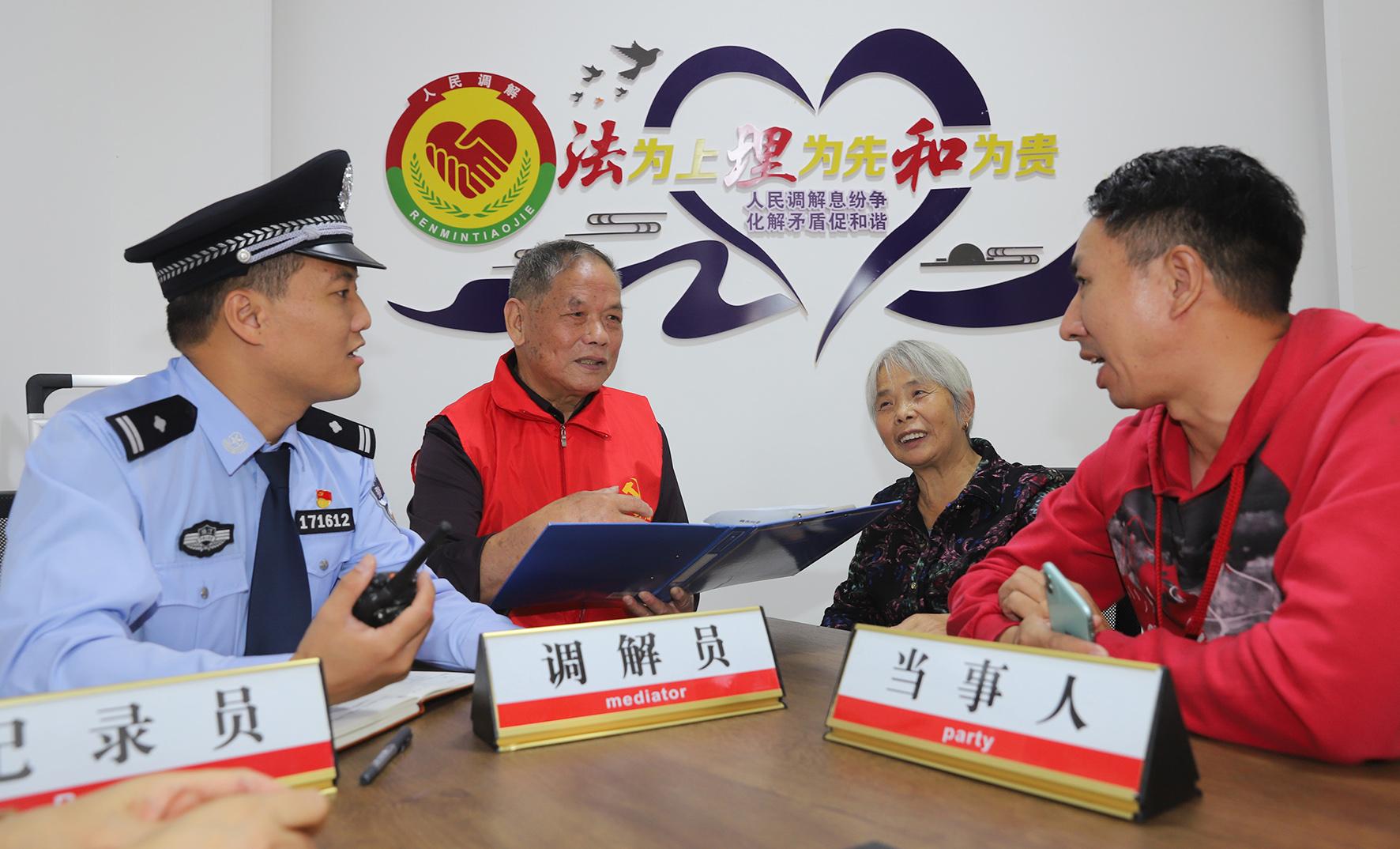 11月4日,浙江省臺州市公安局路橋分局橫街派出所民警會同橫街鎮(zhèn)的離退休老干部在調(diào)處一起民間糾紛。