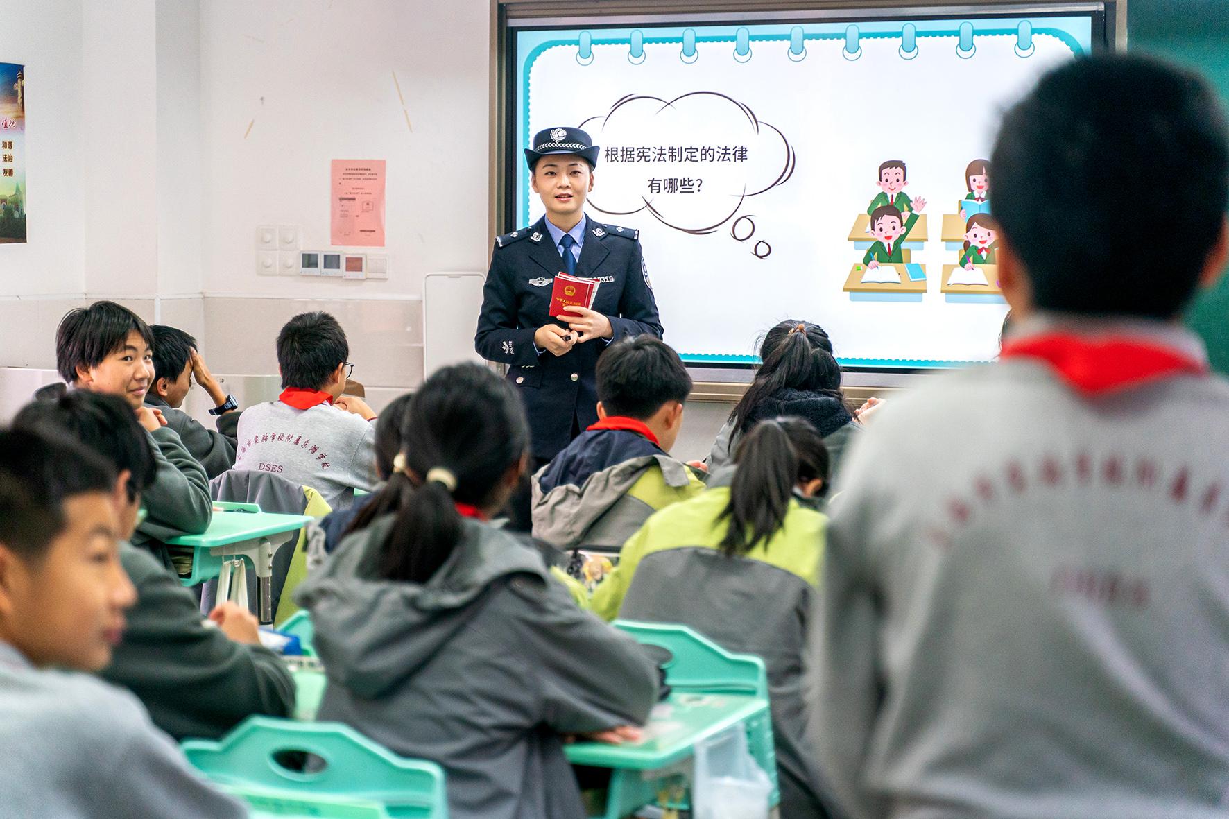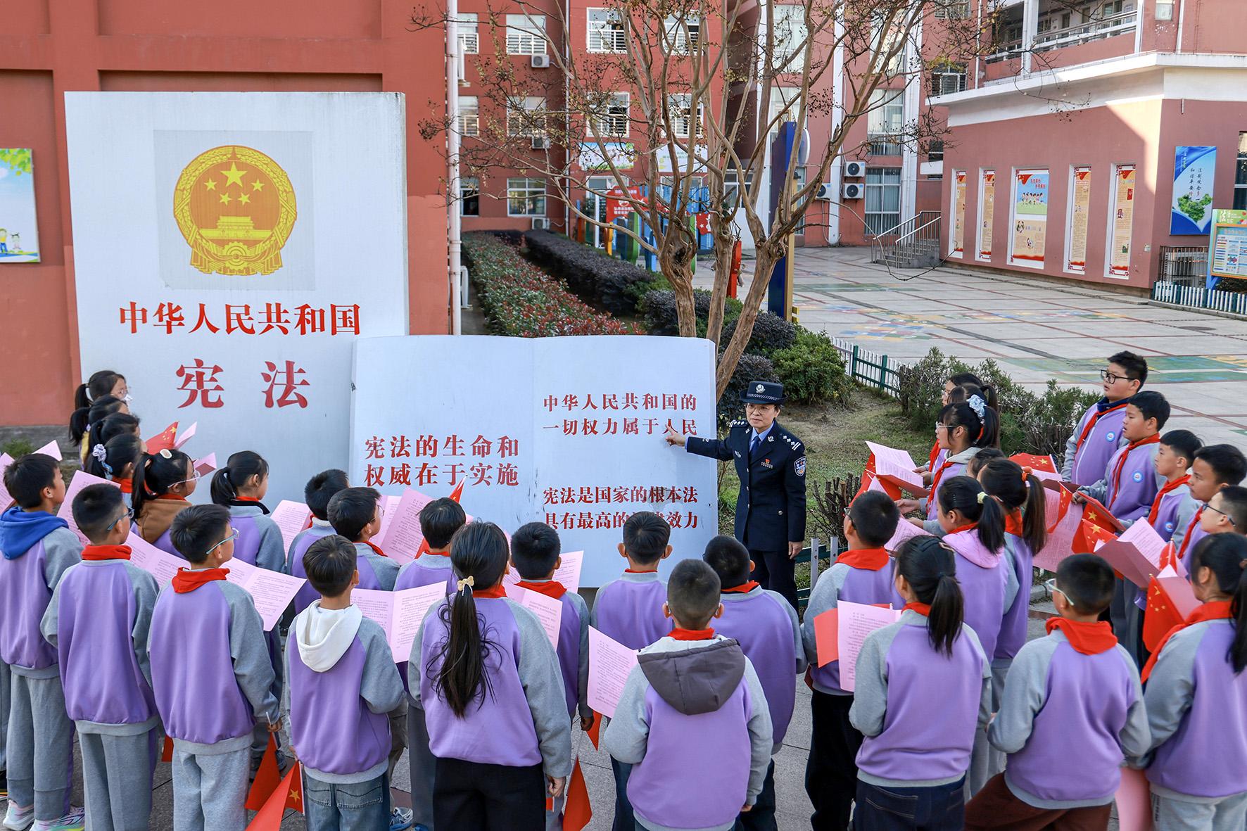 12月2日,安徽省廣德市公安局升平派出所社區(qū)民警來到桃州鎮(zhèn)第四小學(xué)為學(xué)生輔導(dǎo)學(xué)習(xí)憲法知識。