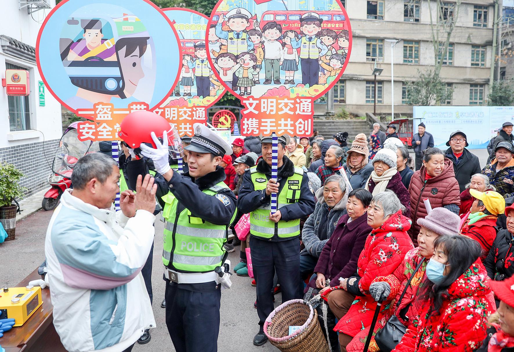 12月23日,四川省華鎣市公安局交通警察大隊民警在天池鎮(zhèn)華光社區(qū),向居民講解安全頭盔的作用和正確戴法。