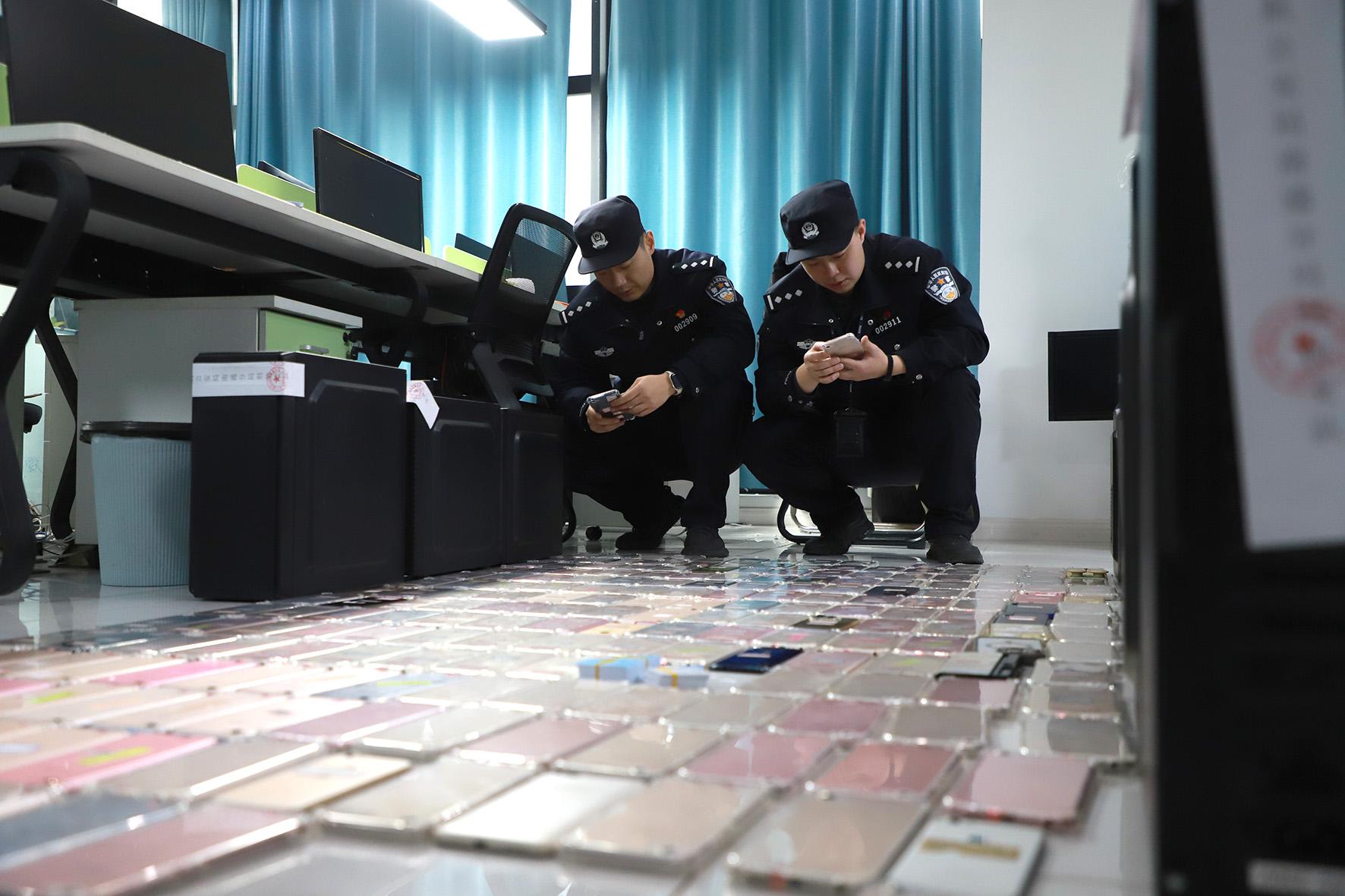圖為民警對作案所使用的手機(jī)、電腦等工具進(jìn)行扣押、清點(diǎn)。