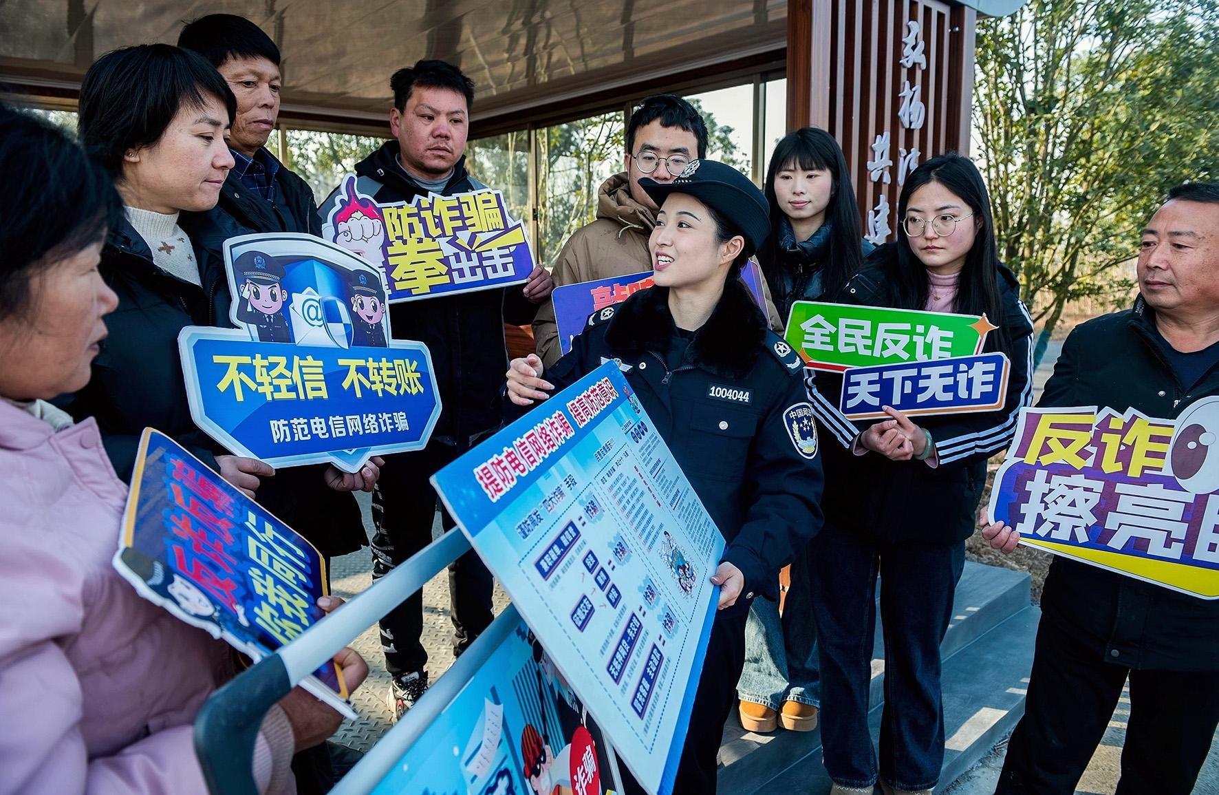 1月13日,安徽省含山縣司法局普法工作者在凌家灘景區(qū)向游客宣傳防范網絡電信詐騙知識。年關將至,含山縣司法局組織開展“全民反詐同行 共筑平安家園”主題宣傳活動。