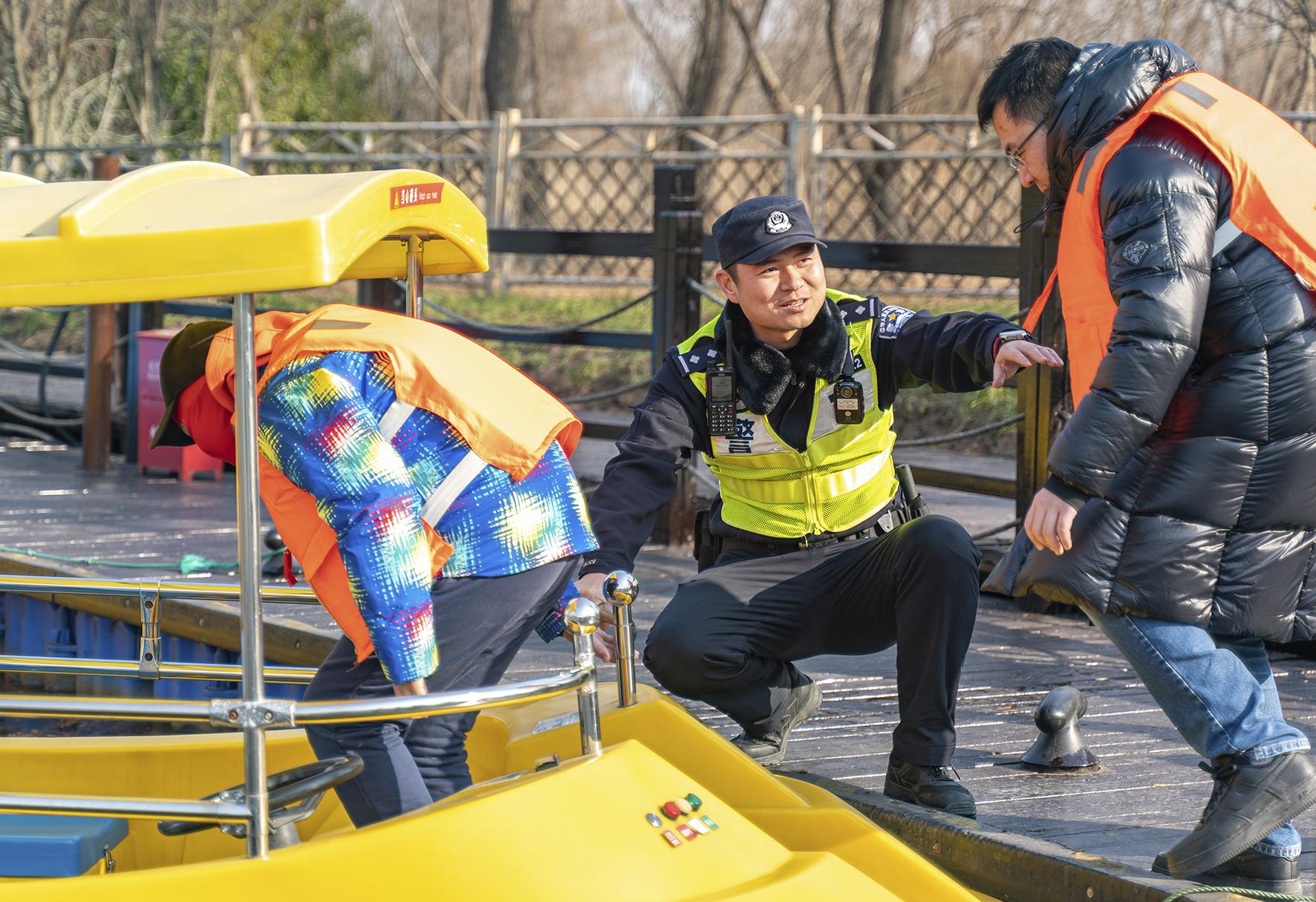 1月13日,上海市公安局崇明分局三星派出所民警在西沙明珠湖景區(qū)開展常態(tài)化巡邏,服務(wù)游客。西沙明珠湖景區(qū)是上海首個以生態(tài)為底色的國家5A級旅游景區(qū)。春節(jié)臨近,三星派出所提前謀劃部署,組織警力開展巡邏駐守,提高見警率,切實當(dāng)好景區(qū)安全的“守護(hù)者”。