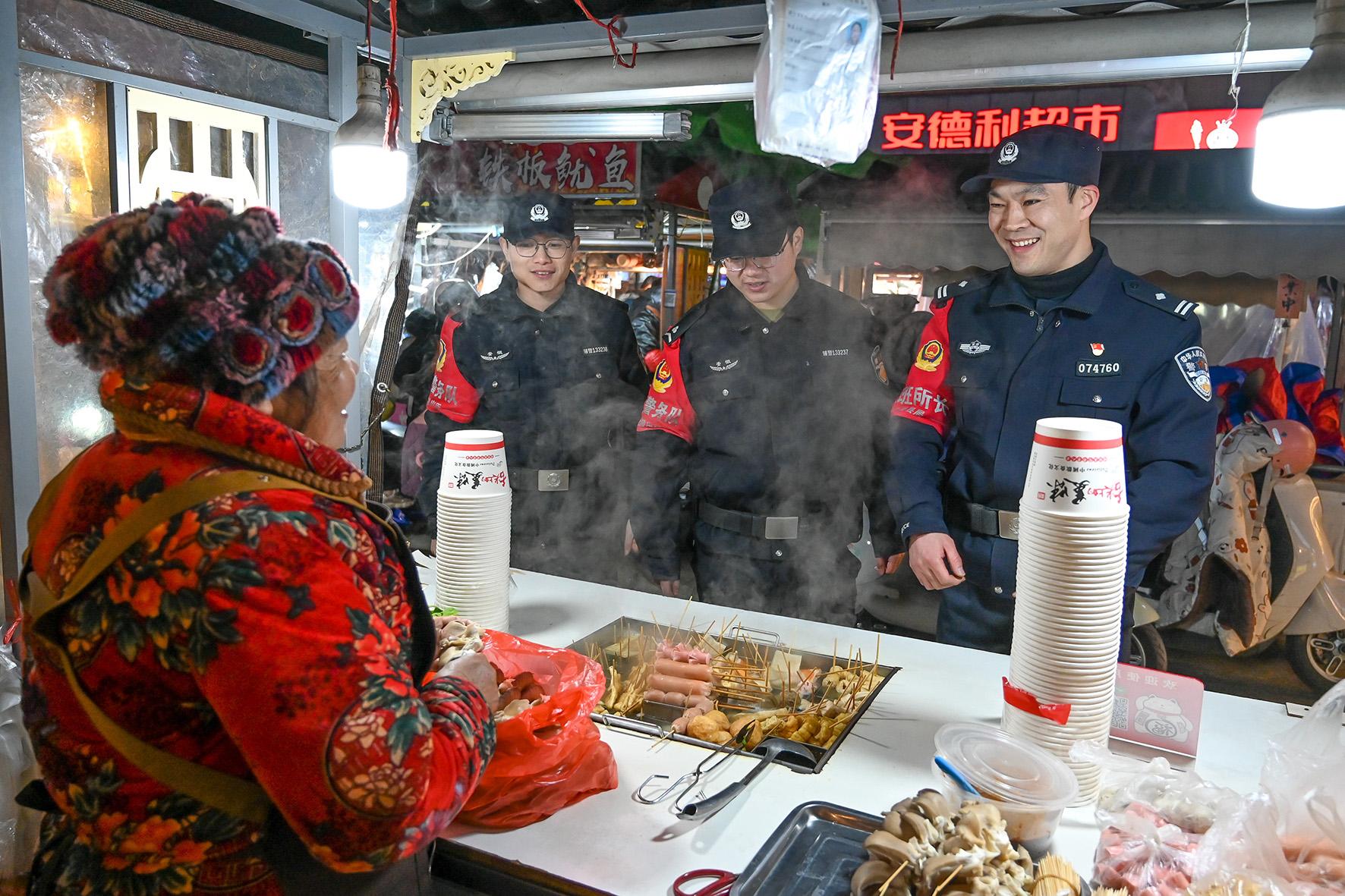 1月13日晚,安徽省馬鞍山市和縣公安局民警在美食街開展徒步巡邏,走訪經(jīng)營戶了解治安狀況,守護(hù)夜市平安。