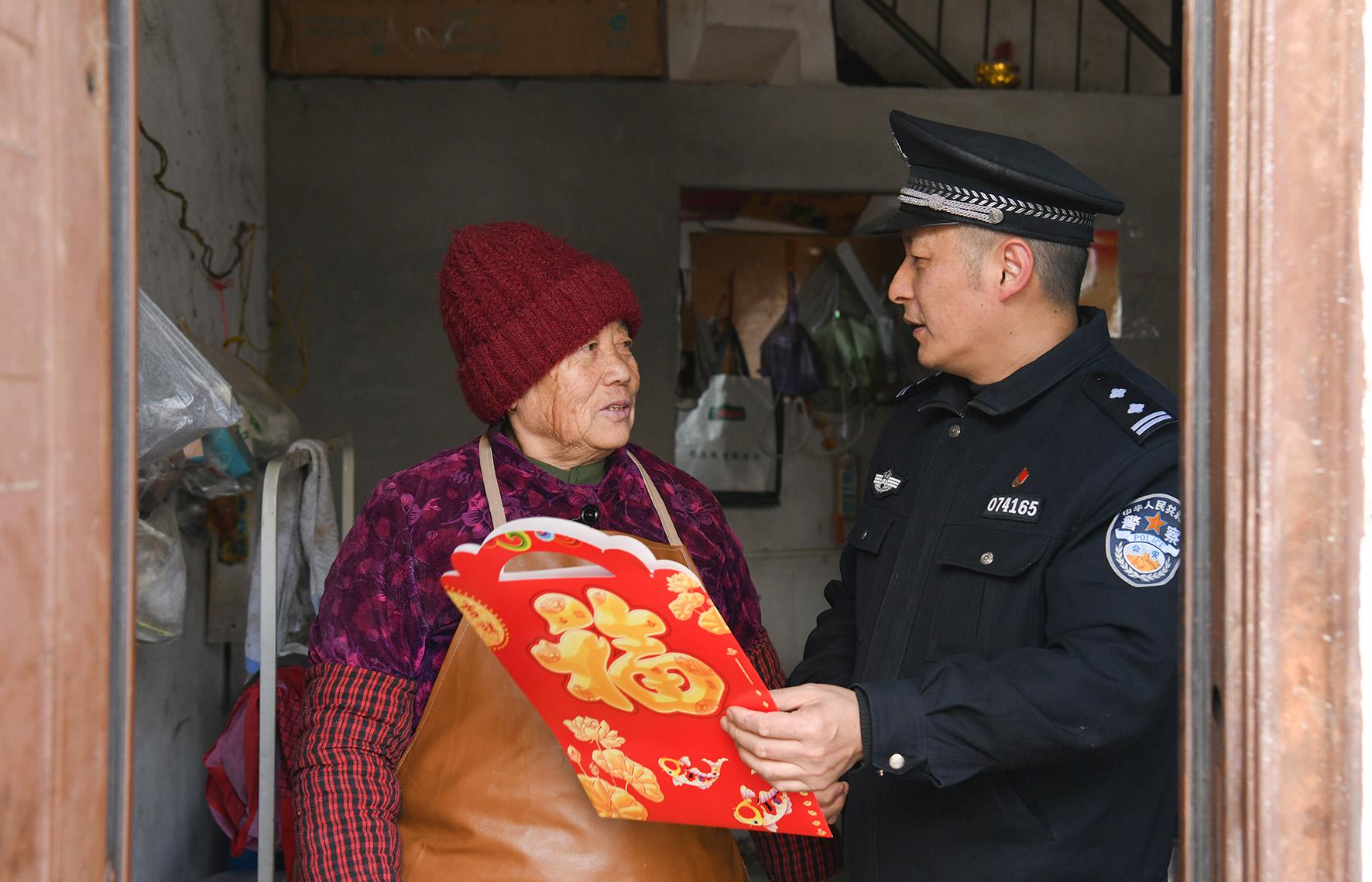 圖為民警為轄區(qū)老年人送福并講解防范養(yǎng)老詐騙知識(shí)。