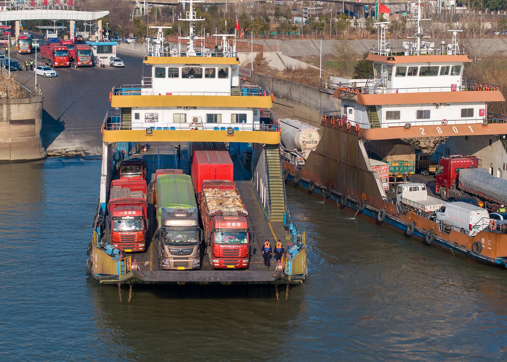1月16日,滿載的汽渡船在長江江蘇泰州段水域劃出一道弧線,避開主航道上的船只駛向?qū)Π丁?/span>