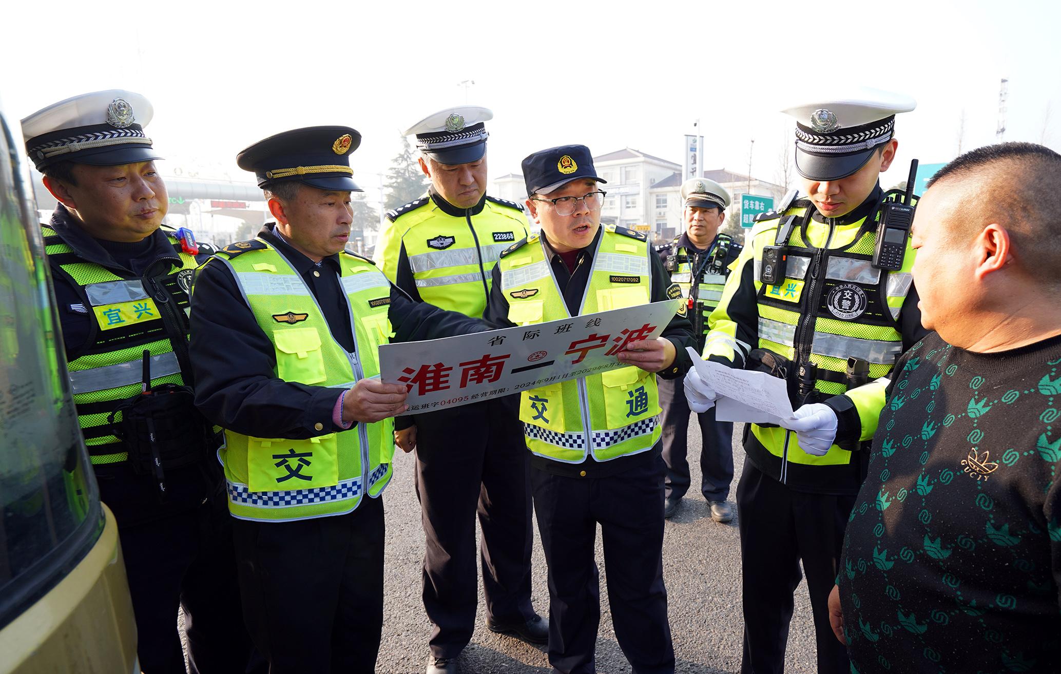 圖為1月21日,執(zhí)法人員在長(zhǎng)深高速宜興站對(duì)過(guò)往“兩客一?!避囕v開(kāi)展檢查。