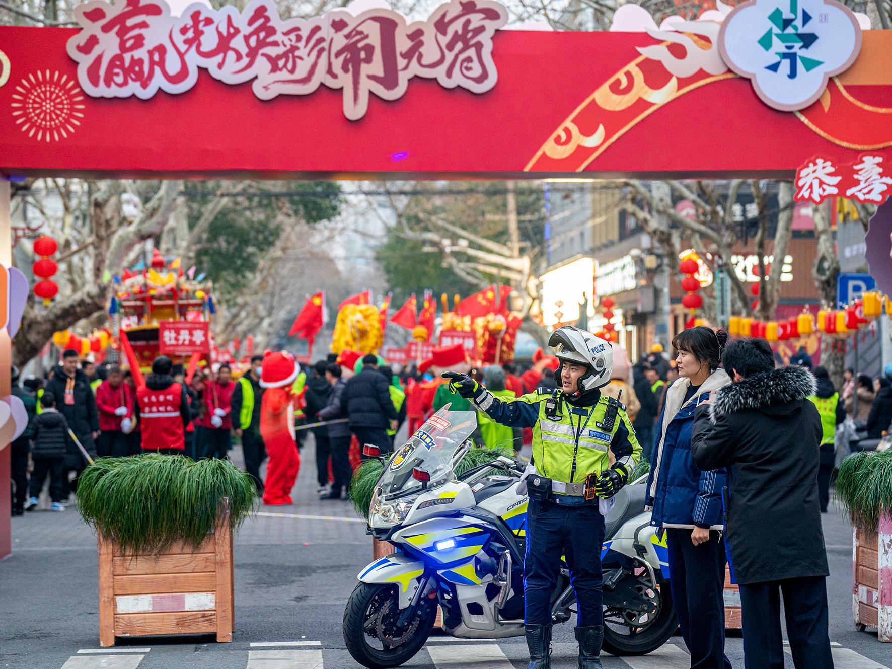 2月12日,安徽省蕪湖市公安局鏡湖分局聯(lián)合鏡湖交警大隊抽調(diào)近百名警力為大型龍燈巡游活動保駕護(hù)航。