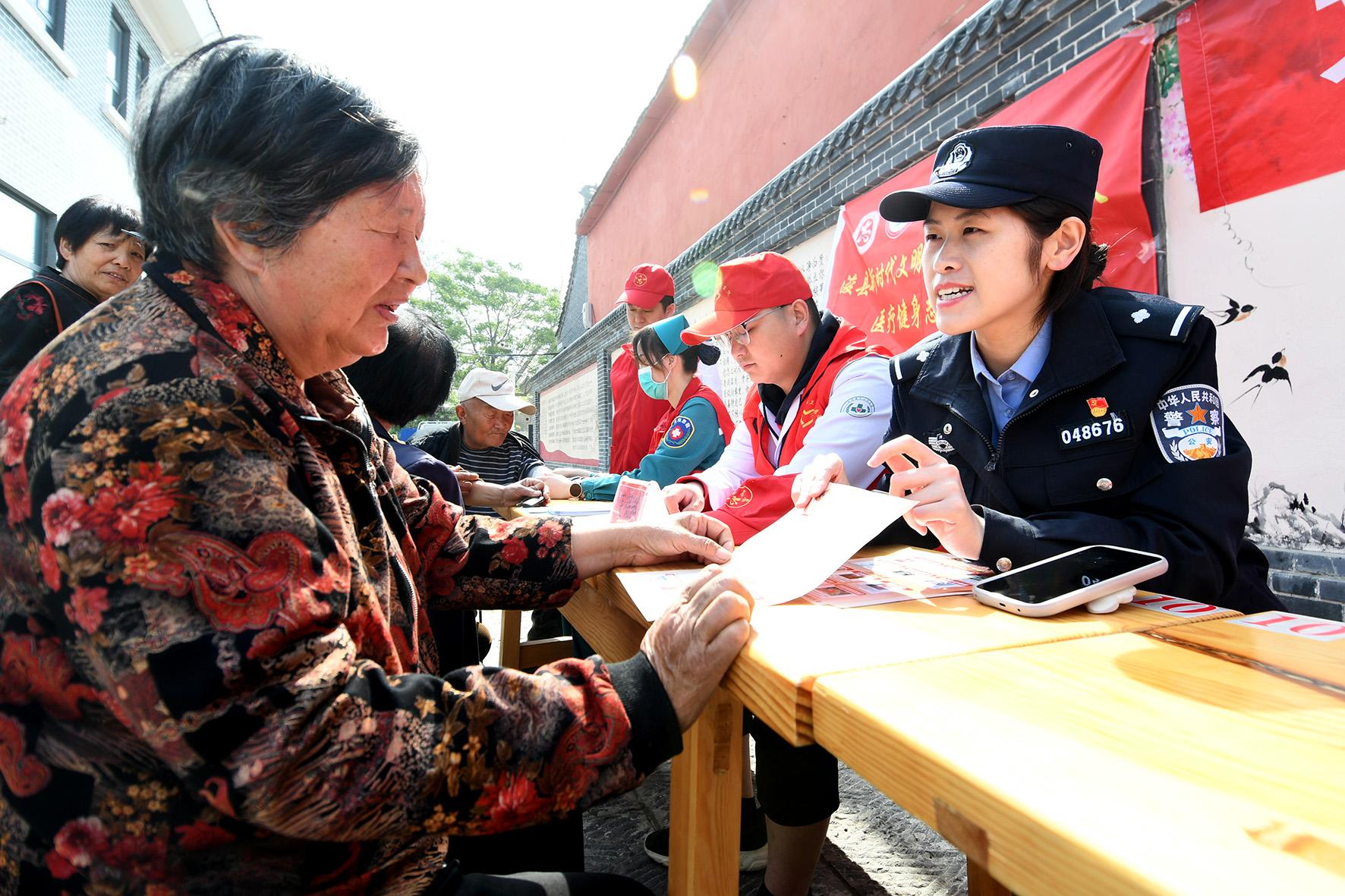 4月22日,河南省浚縣公安局白寺派出所民警來(lái)到轄區(qū)白寺村,面對(duì)面向老年人講解安全防范知識(shí)。