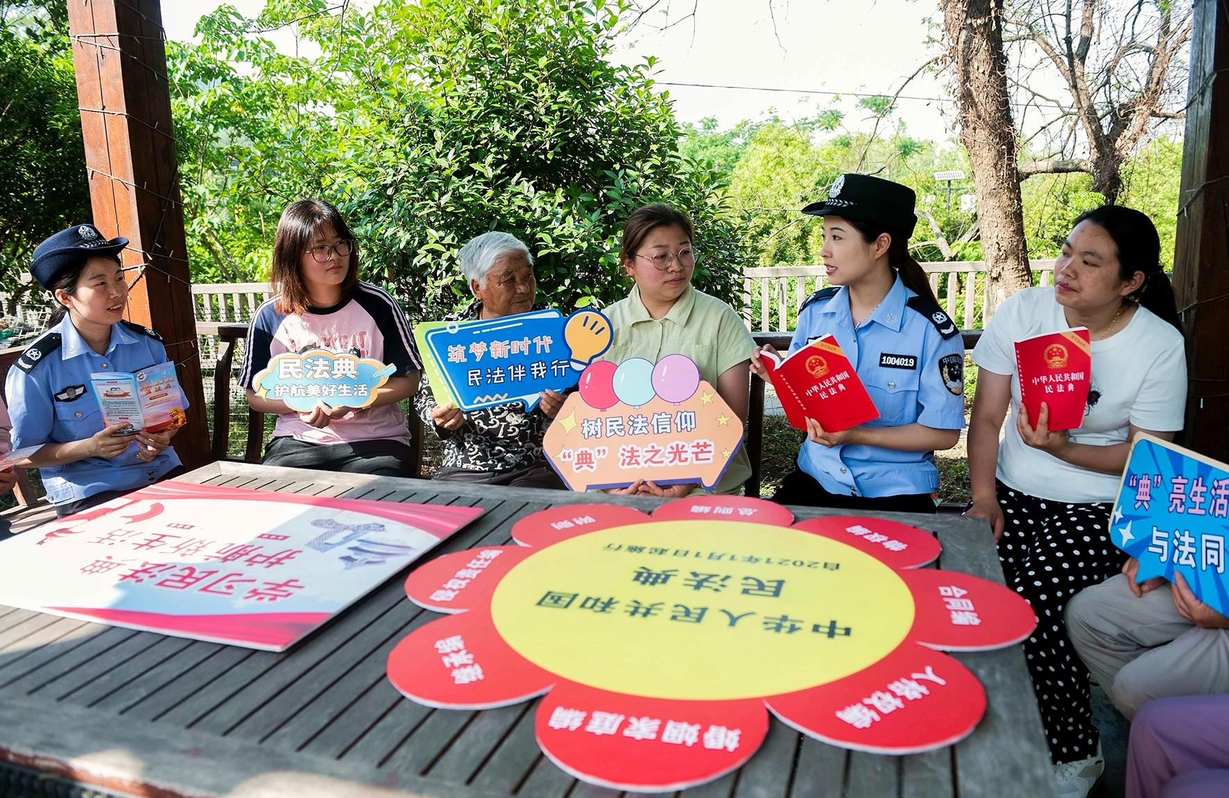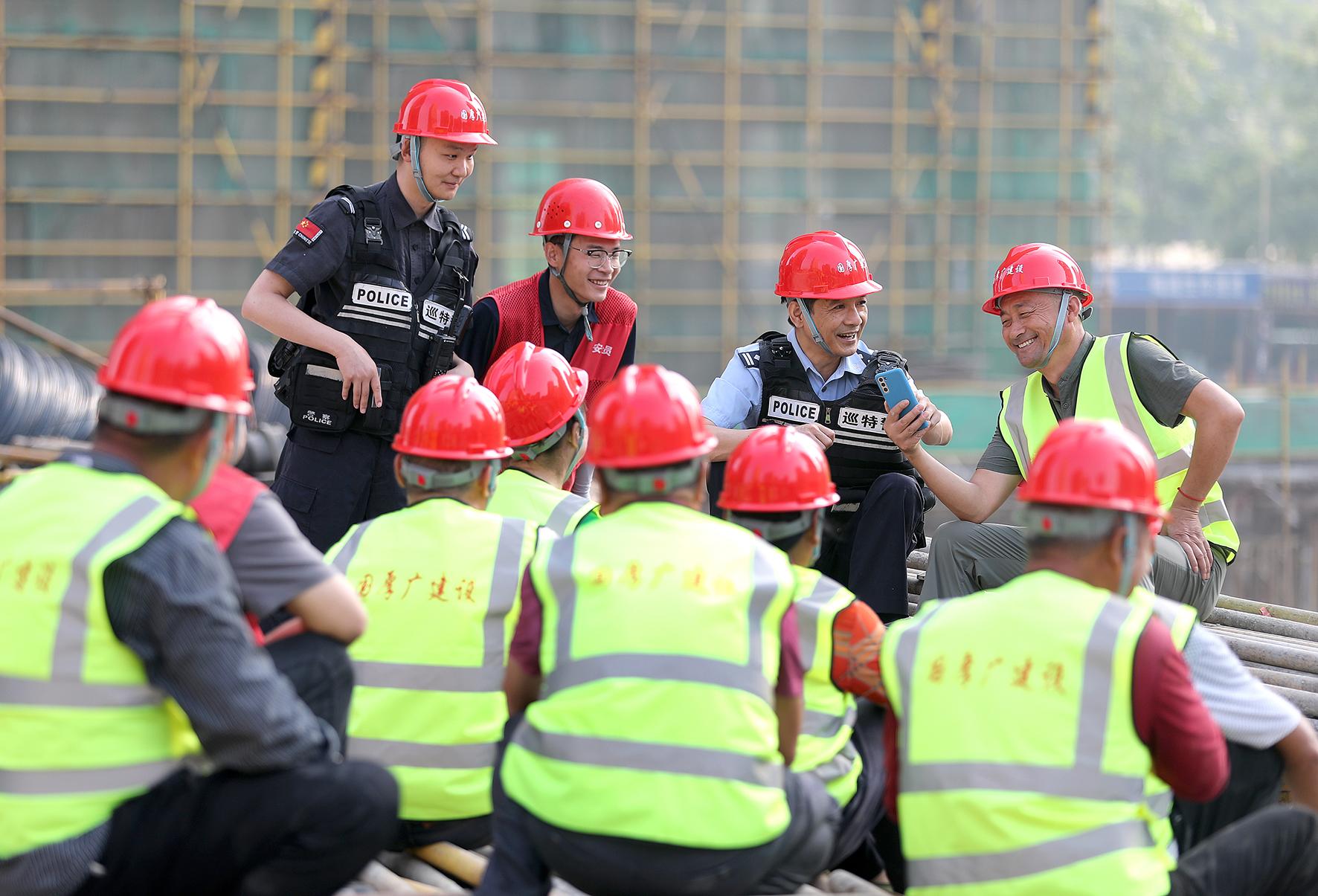 5月20日,在湖北省荊門市漳河新區(qū)一處建筑工地,荊門市公安局巡特警支隊生態(tài)運動公園警務(wù)站民警利用“班前會”,向工友們普及民法典相關(guān)知識。