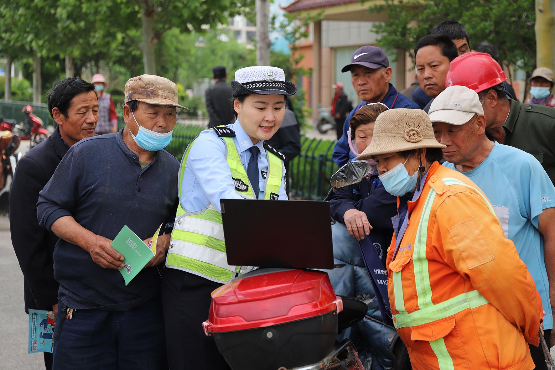5月20日,山東省臨沂市公安局交警支隊(duì)郯城大隊(duì)民警輔警結(jié)合務(wù)工人員出行特點(diǎn),向他們普及道路交通法律法規(guī)和安全知識。