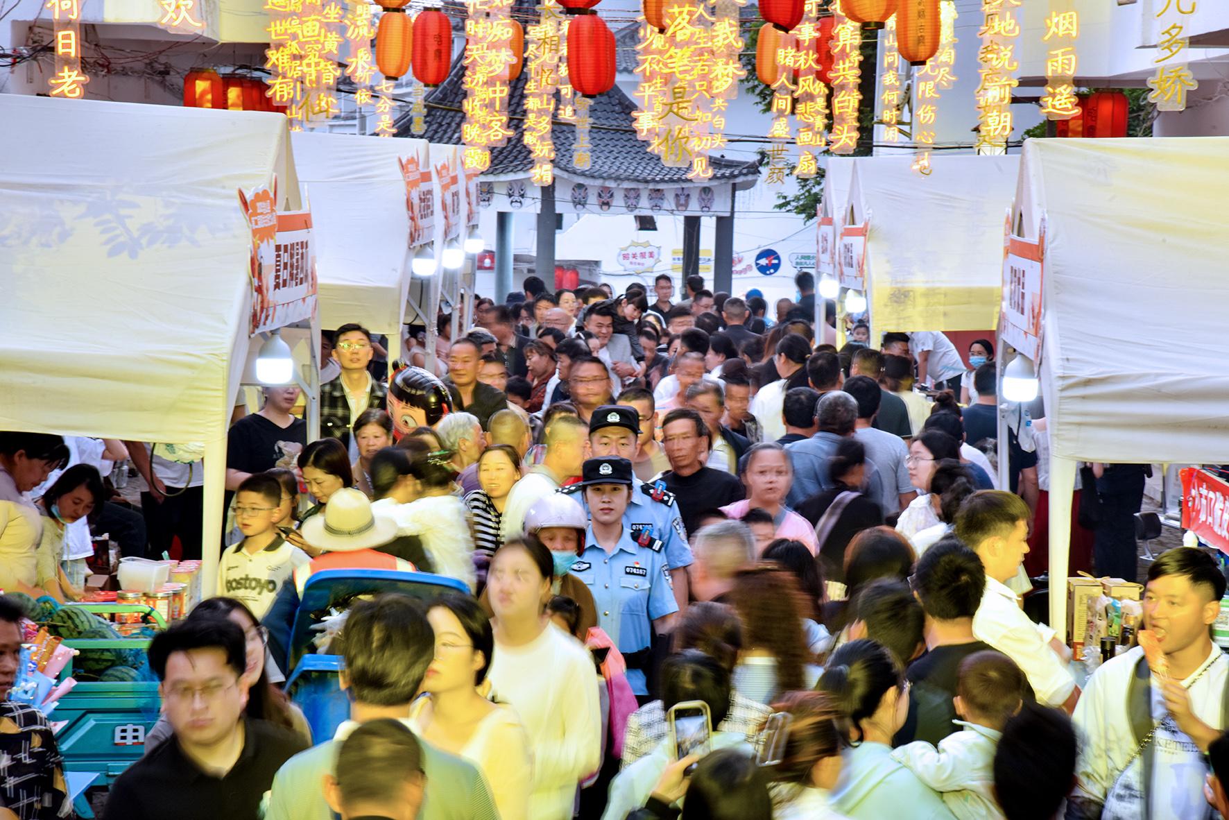5月24日,安徽省馬鞍山市含山縣公安局民警在昭關(guān)古街龍蝦宴現(xiàn)場(chǎng)巡邏執(zhí)勤。