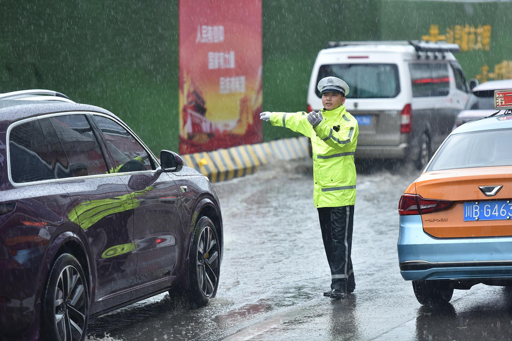 5月27日,四川綿陽遭遇強(qiáng)降雨天氣。綿陽市公安局交警支隊直屬一大隊民輔警提前上崗,在復(fù)雜路口、路段指揮疏導(dǎo)車輛,確保道路安全暢通。