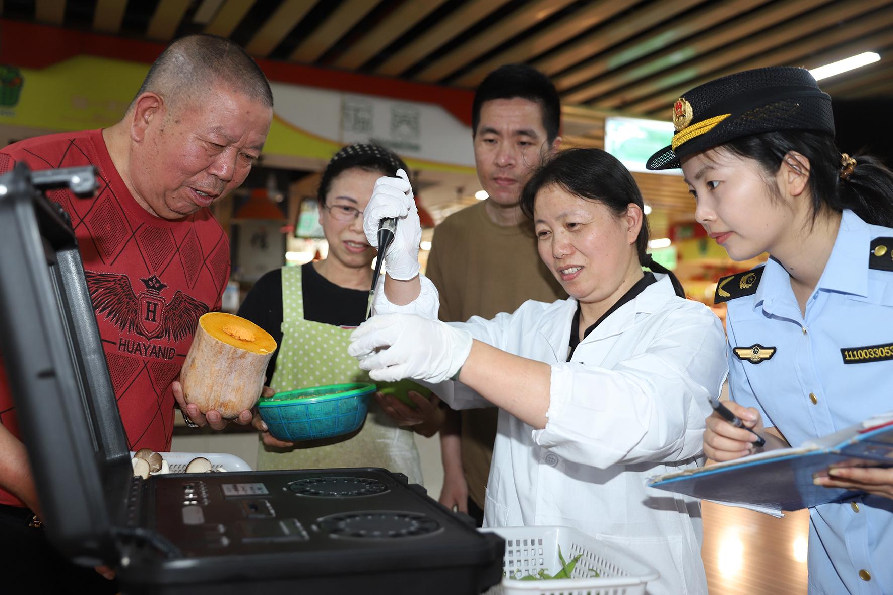 5月29日,浙江省臺州市路橋區(qū)橫街鎮(zhèn)市場監(jiān)督管理所推出“你點(diǎn)我檢”舉措,在菜市場門口為群眾提供蔬菜農(nóng)藥殘留檢測服務(wù)。