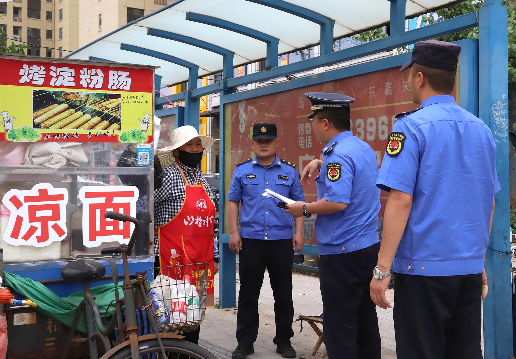 6月3日,山東省郯城縣綜合執(zhí)法人員對一個高考考點附近的流動商販進行勸導。
