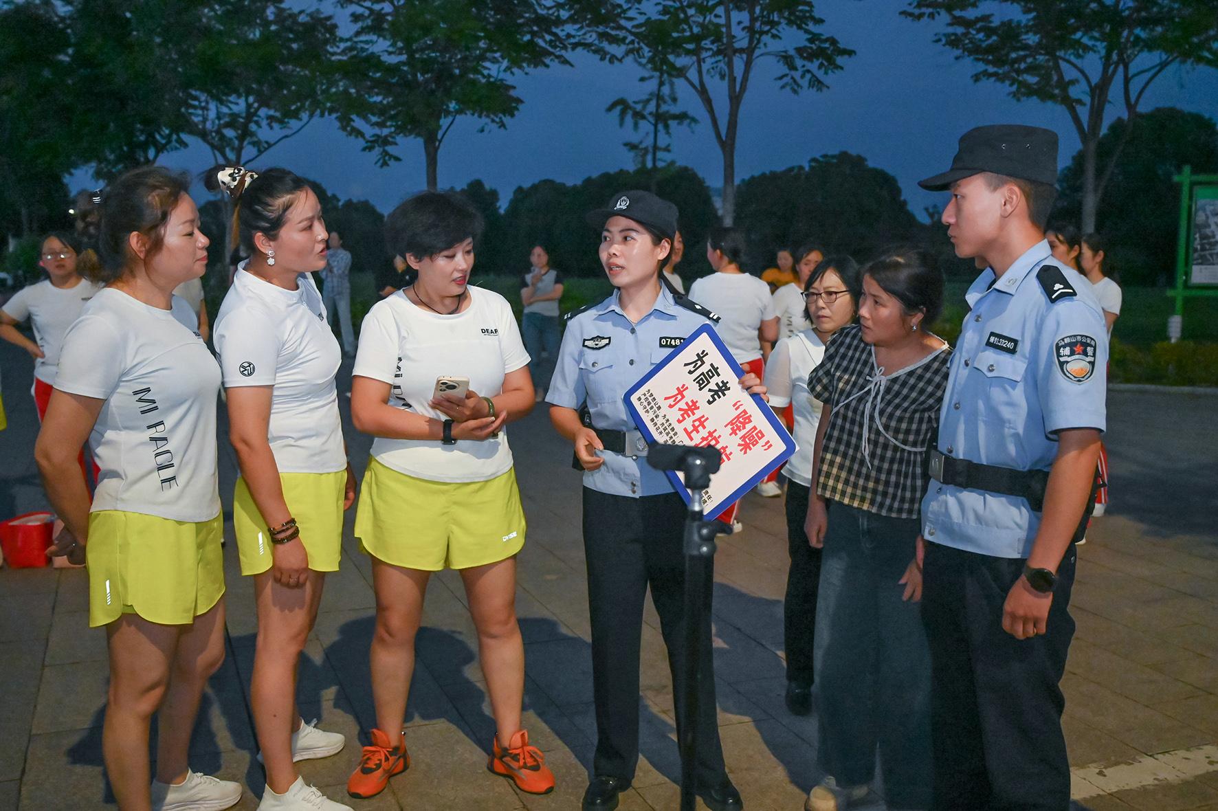 6月3日晚,安徽省馬鞍山市和縣公安局民警向跳廣場舞的市民宣講高中考期間“禁噪”規(guī)定,積極倡導大家營造一個安全安靜的考試環(huán)境。