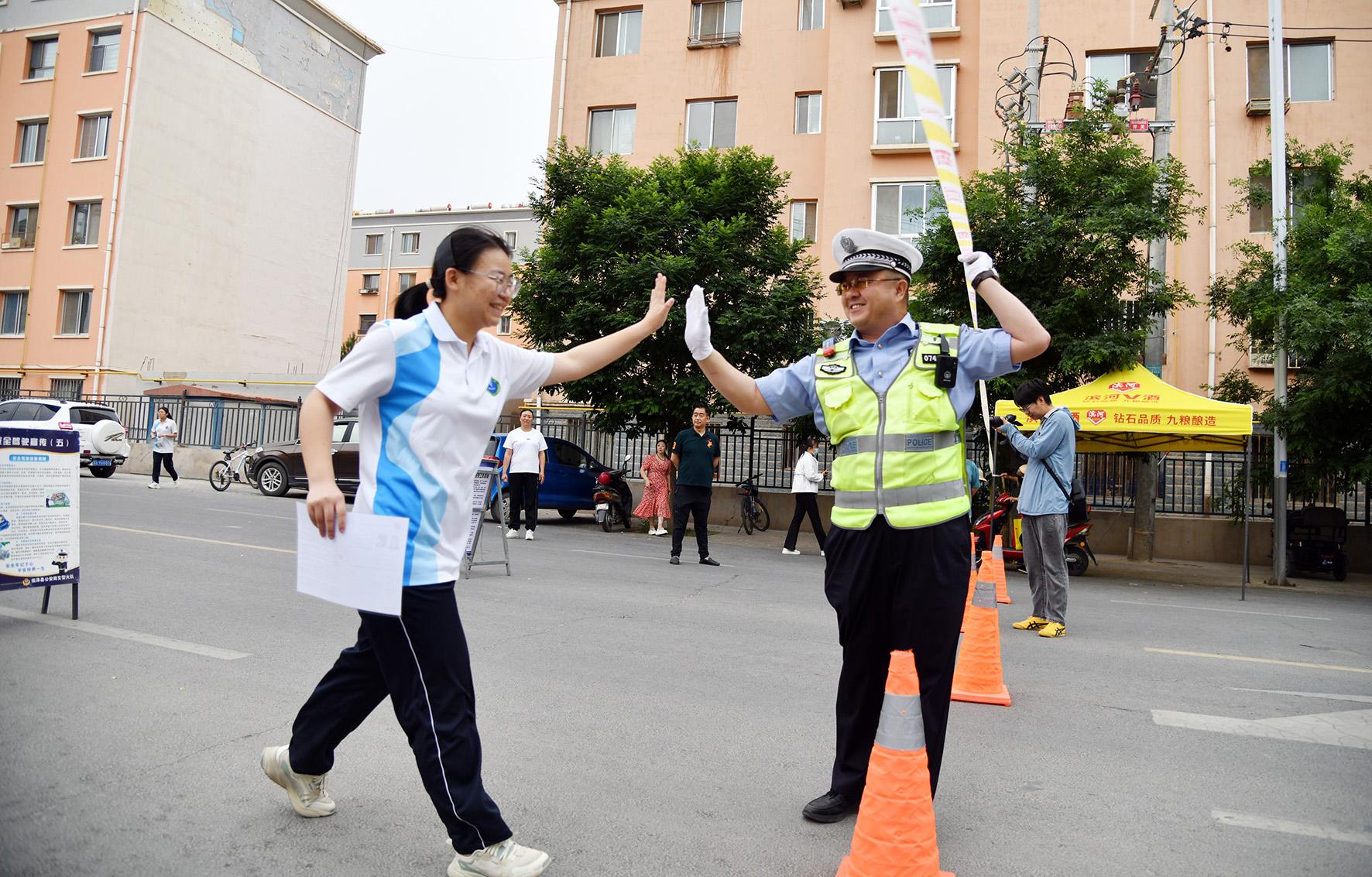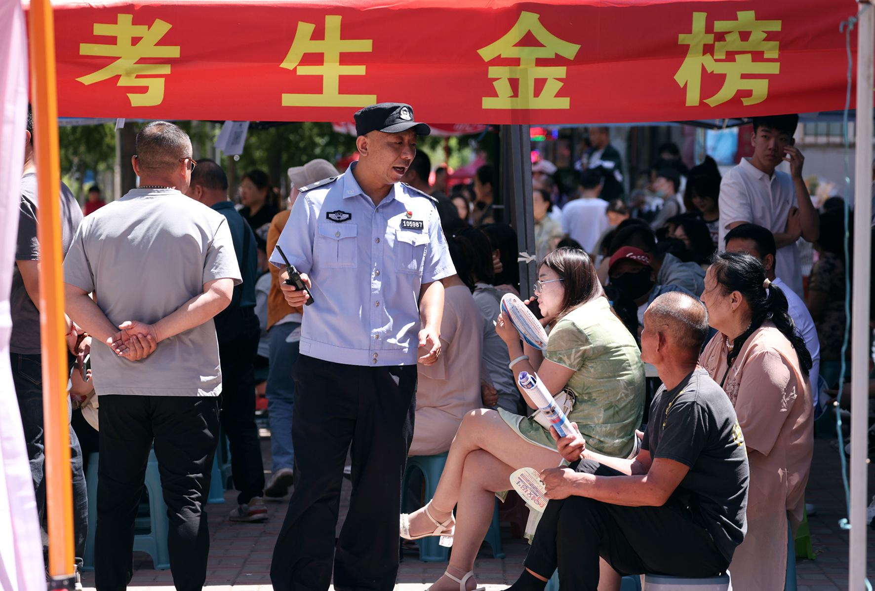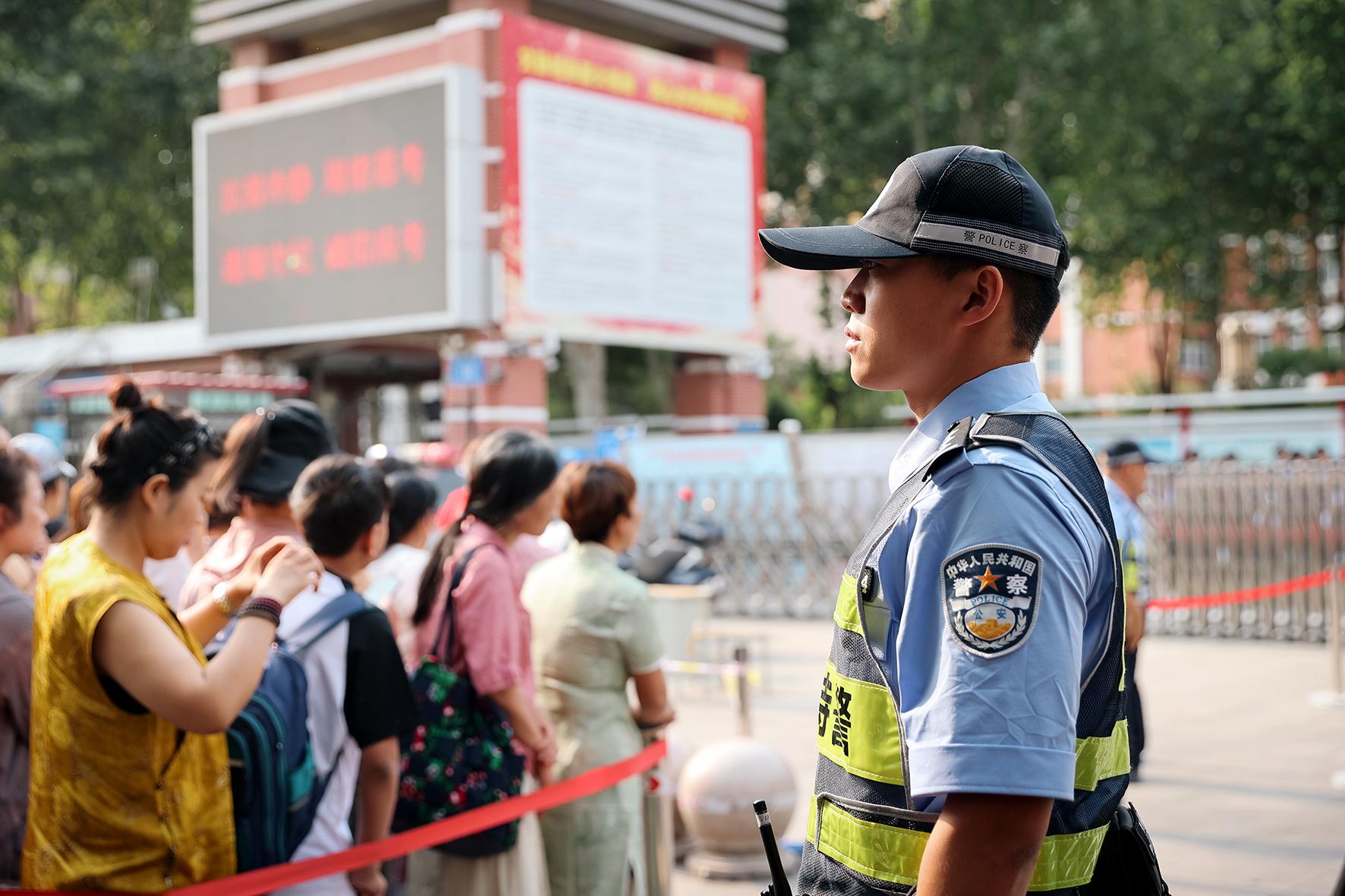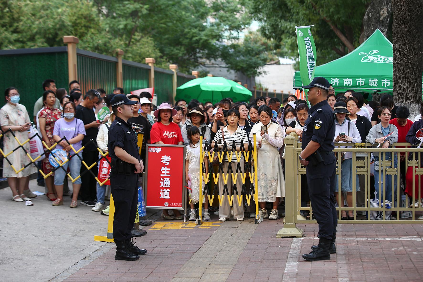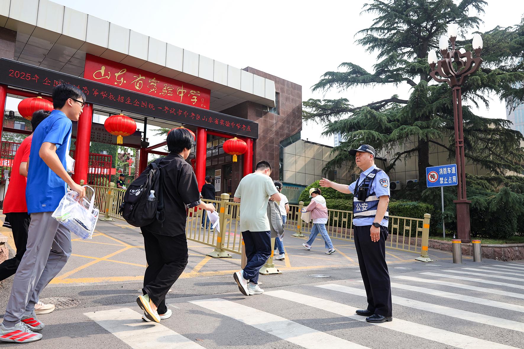6月7日,在山東省實驗中學(xué)考點,濟南市公安局市中區(qū)分局桿石橋派出所執(zhí)勤民警引導(dǎo)考生有序進(jìn)場。