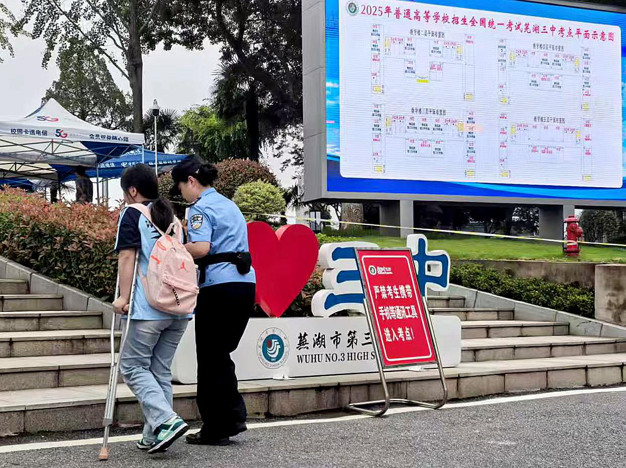 6月9日,安徽省蕪湖市公安局鏡湖分局赭麓派出所所長劉莉連續(xù)三天為一名行動不便的考生提供幫助。