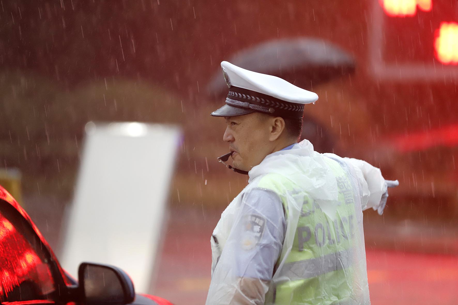 6月8日,江西省九江市公安局潯陽分局民輔警冒雨在九江市三中考點指揮疏導(dǎo)交通。
