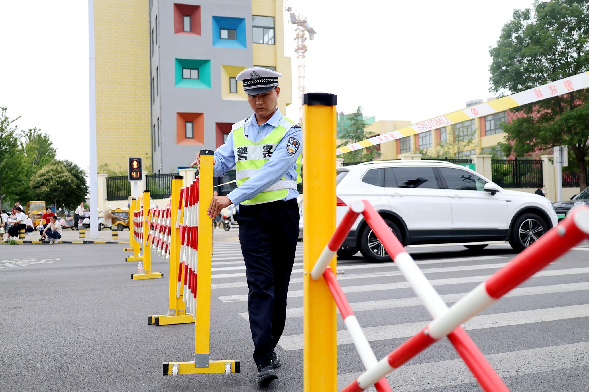 6月7日,江蘇省宜興市公安局環(huán)科園派出所社區(qū)民警在宜興市第二高級中學(xué)考點為考生護(hù)航加油。