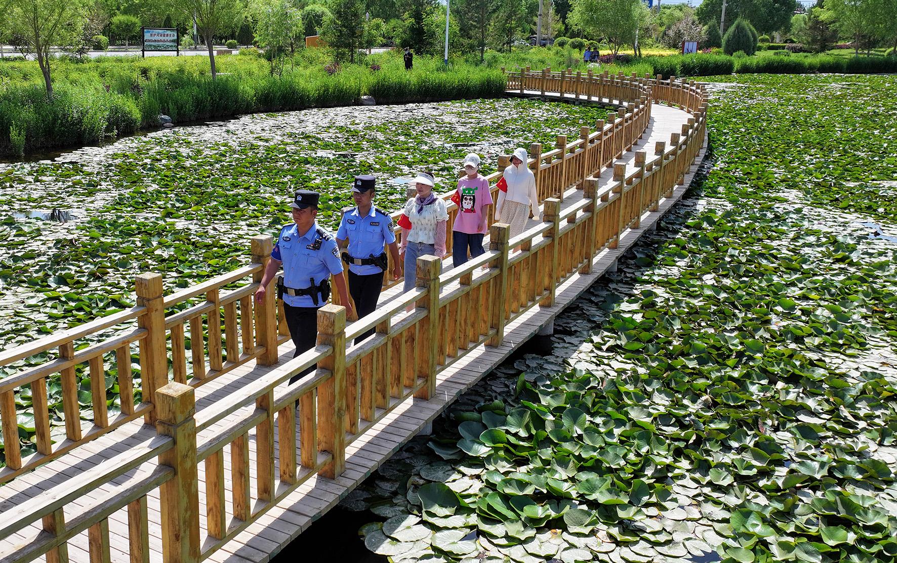6月10日,甘肅省臨澤縣公安局沙河派出所民輔警聯(lián)合生態(tài)義警來(lái)到轄區(qū)荷花池塘進(jìn)行聯(lián)防聯(lián)巡。