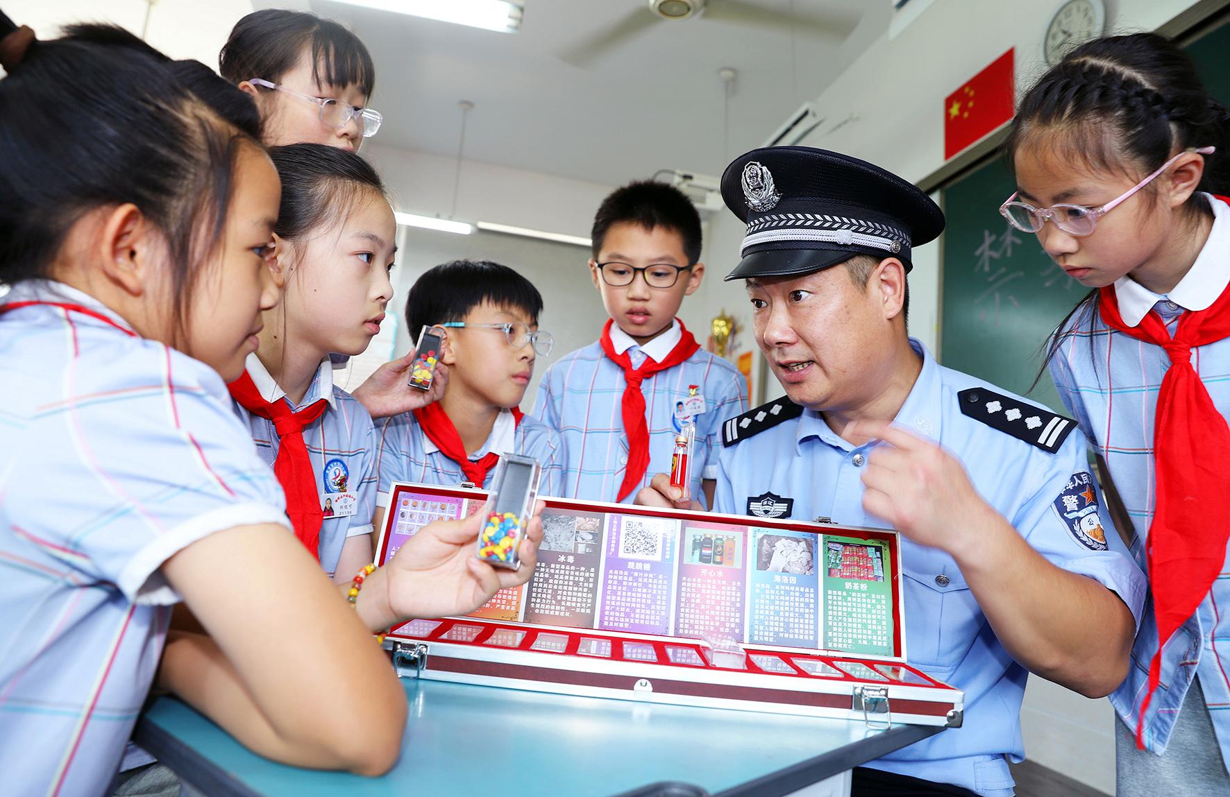 6月17日,浙江省臺州市路橋區(qū)桐嶼派出所民警在路橋區(qū)外國語小學(xué)向小朋友講解毒品的危害。