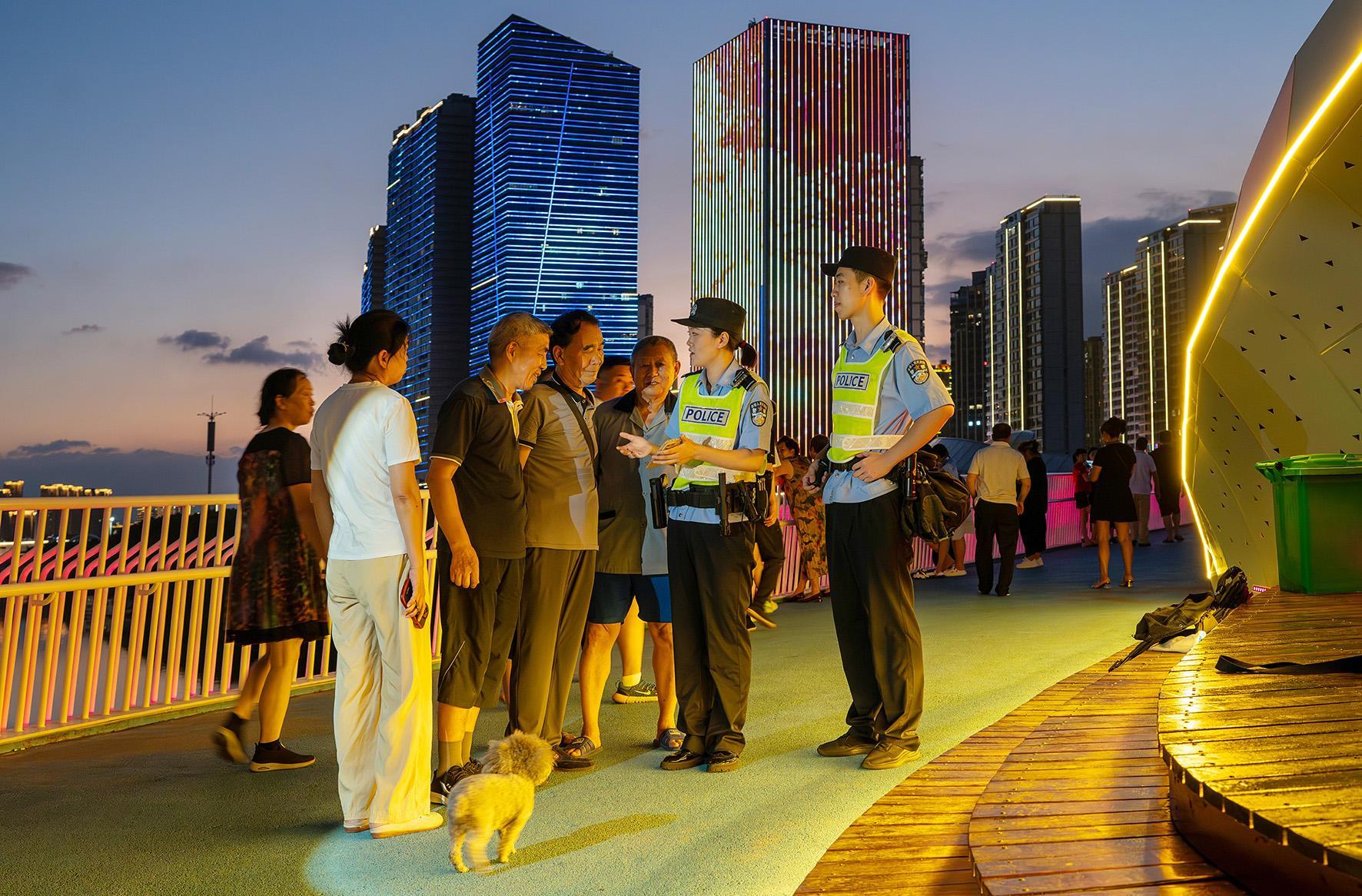 圖為7月3日晚,民警在永寧江景觀橋巡邏,并向群眾宣傳夏季安全防護(hù)知識。