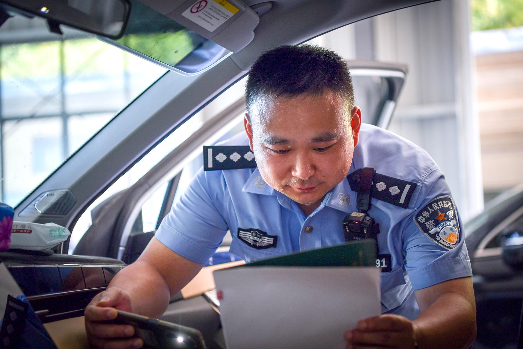 7月7日,小暑節(jié)氣。安徽省涇縣公安局交管大隊車管所民警在高溫下認真檢查車輛信息。