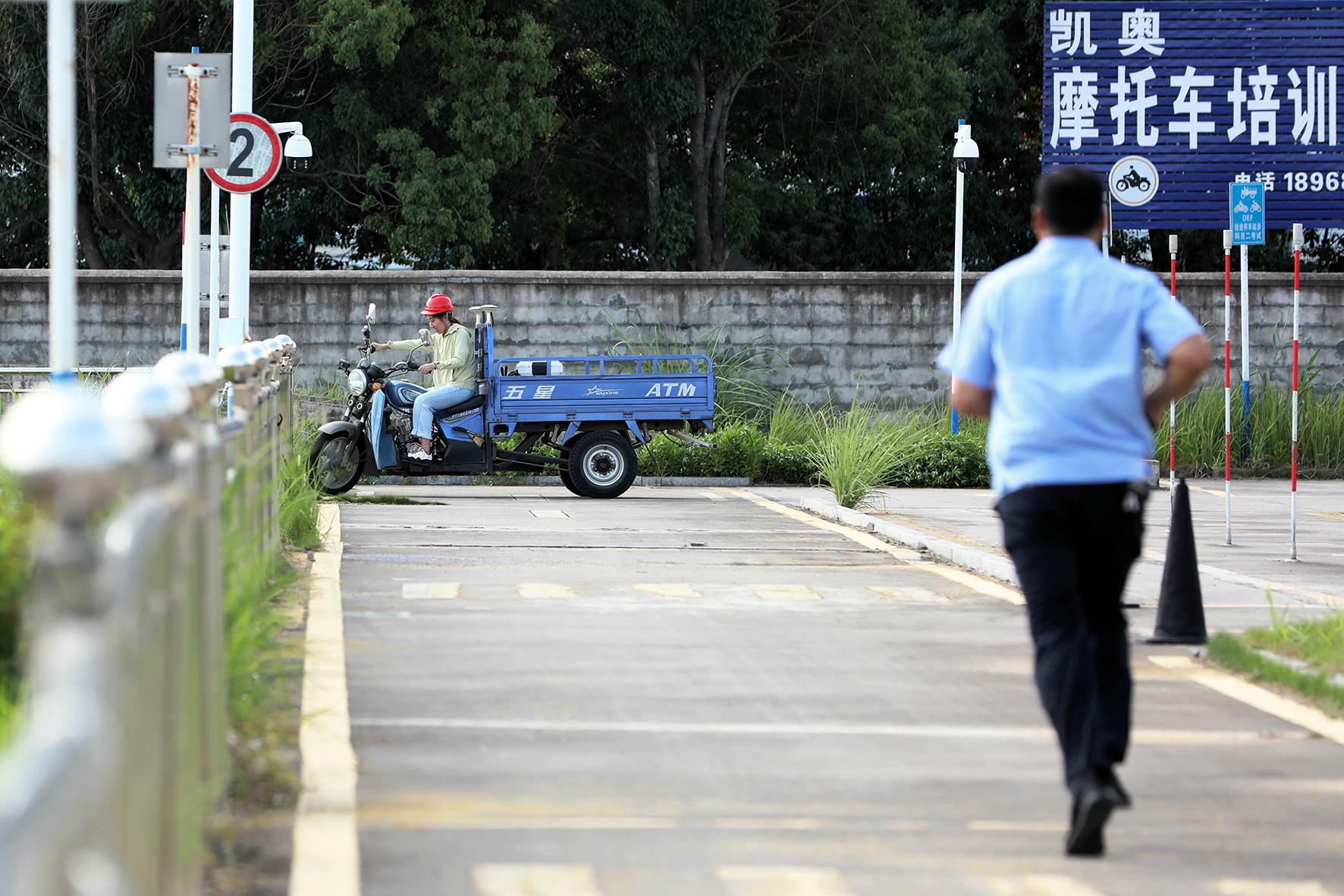 7月4日,安徽省寧國市公安局交通管理大隊車輛管理所民警輔警在高溫橙色預警天氣下堅守崗位,持續(xù)為摩托車駕駛學員們提供駕考服務。