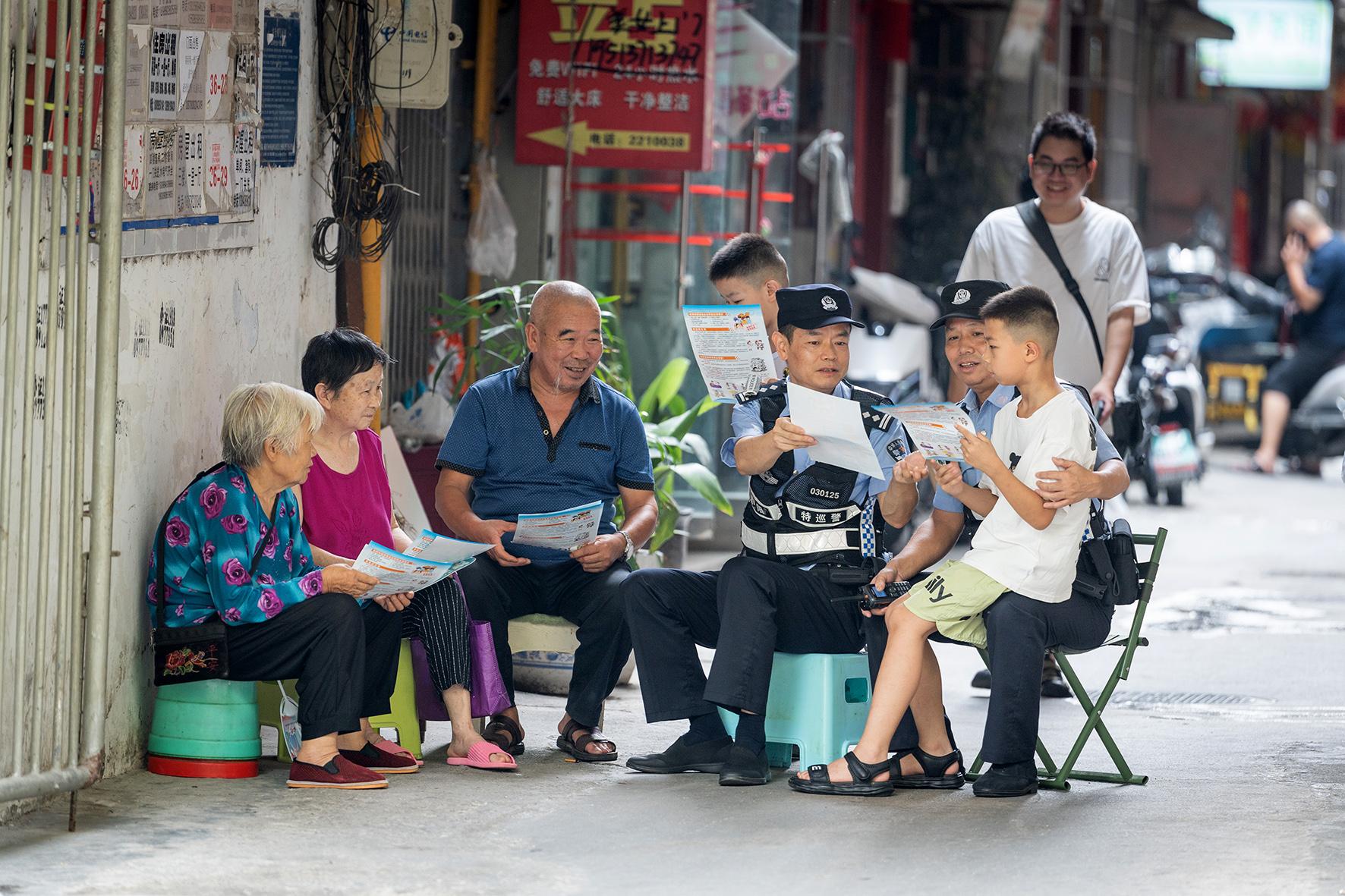 圖為7月16日,特巡警支隊巡邏一大隊的民警在涪城區(qū)南河五六社區(qū)向居民宣講反詐知識。