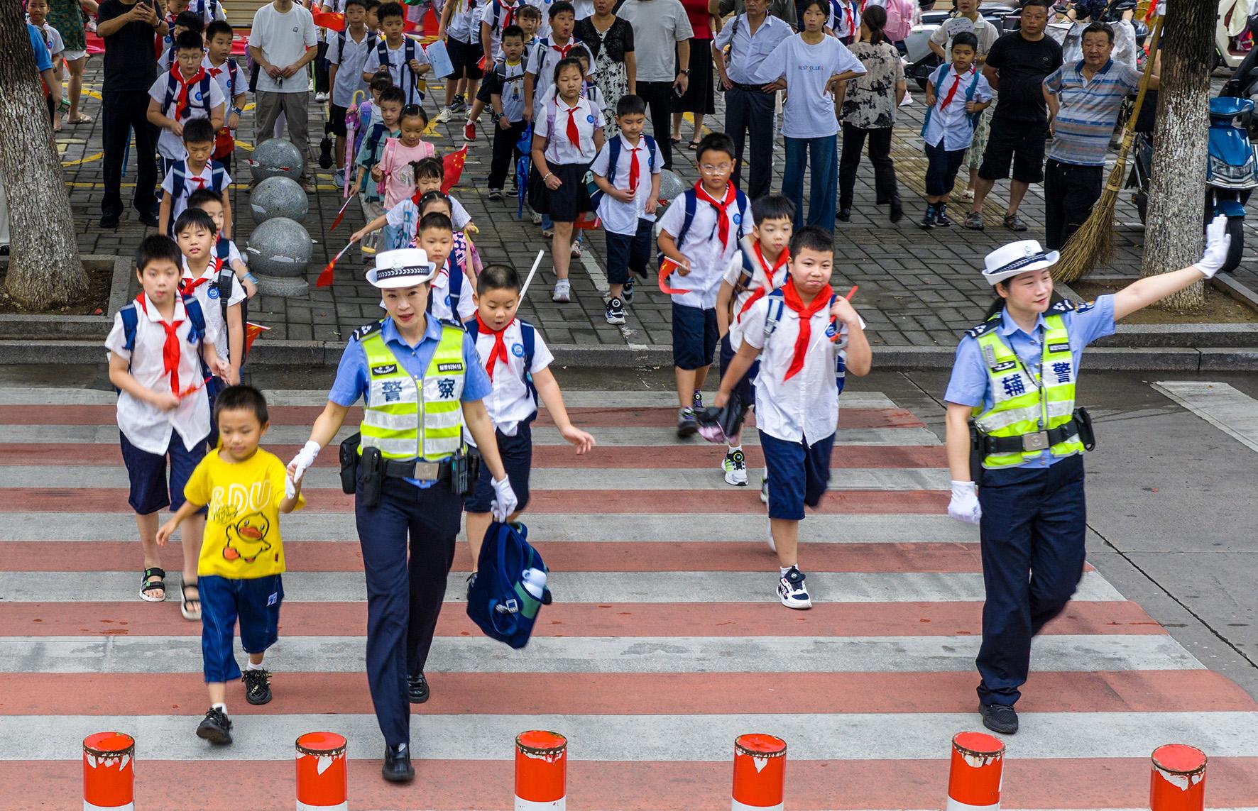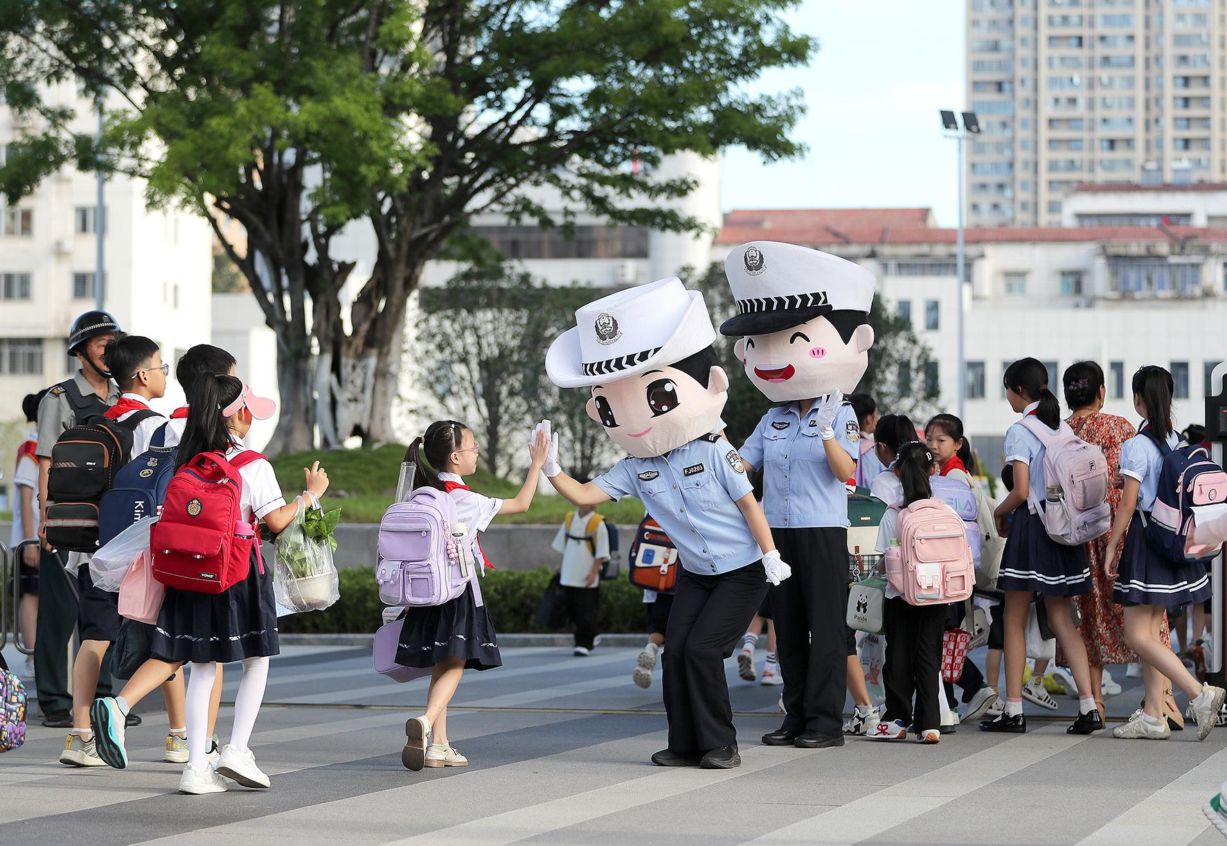 9月1日,安徽省蕪湖市公安局交警支隊弋江大隊女子護學(xué)崗民警,在安徽師范大學(xué)附屬小學(xué)(西校區(qū))護送小學(xué)生平安上學(xué)。