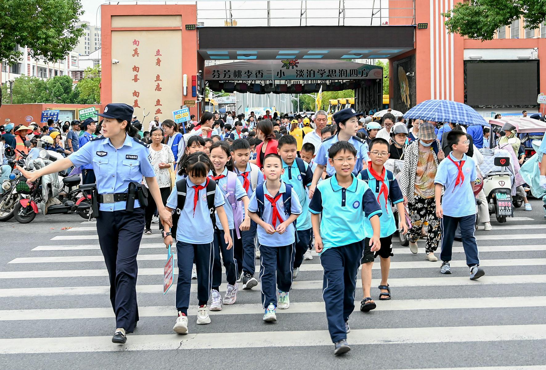 9月1日,江西省九江市公安局交管支隊潯陽大隊民輔警在轄區(qū)學(xué)校門口維護秩序。