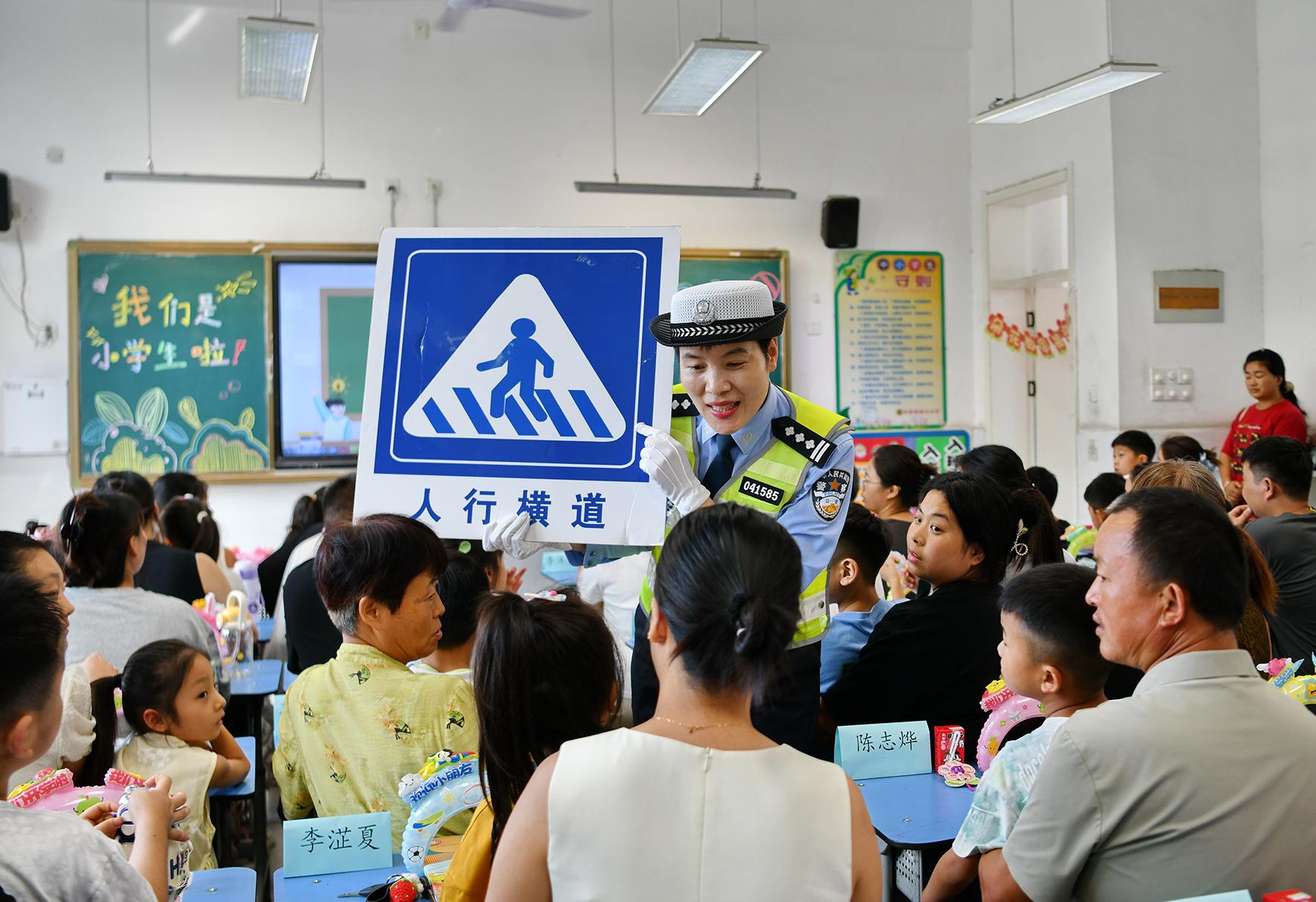 9月1日,安徽省阜南縣公安局交管大隊“護學(xué)崗”民警在第三小學(xué)向一年級新生和家長們宣講出行安全知識。