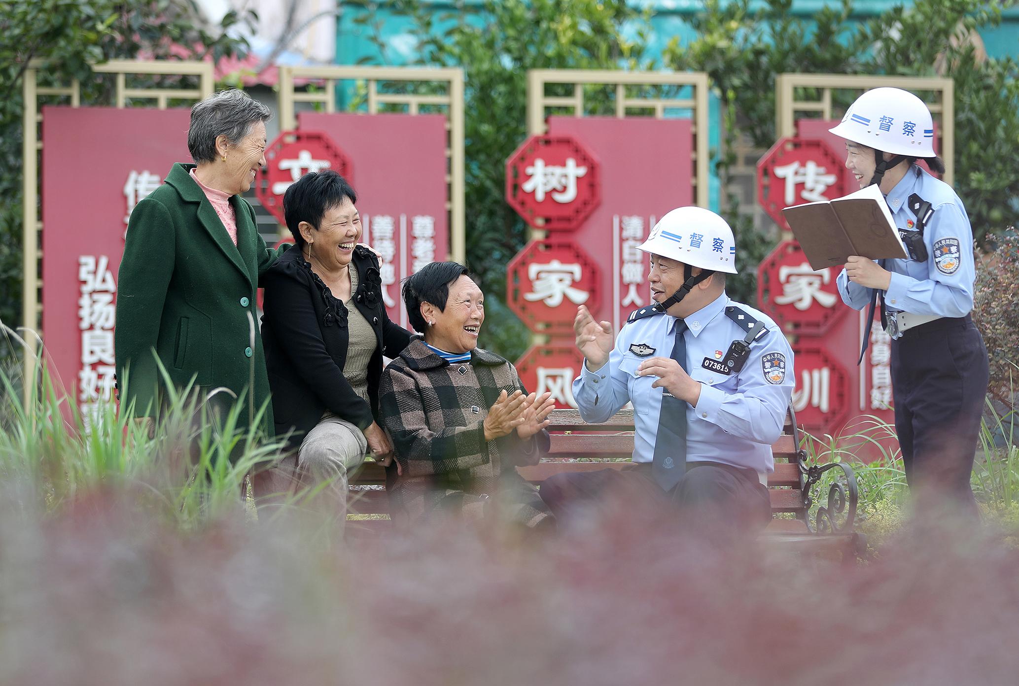 9月22日,在湖北省荊門市沙洋縣三峽土家族村,沙洋縣公安局督察大隊(duì)民警與村民“嘮家常”,傾聽群眾對(duì)公安服務(wù)的需求與建議。