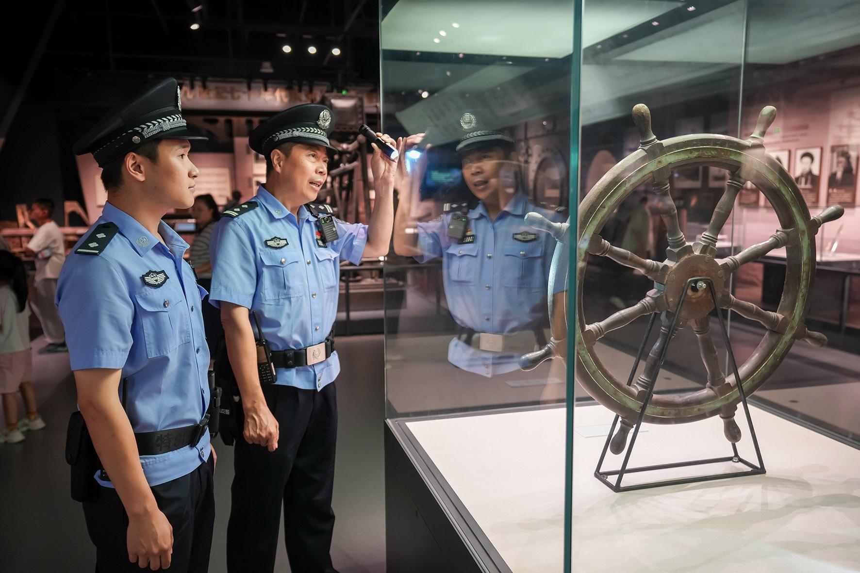 圖為快安派出所民警在中國船政文化景區(qū)檢查館藏文物展品安全情況。