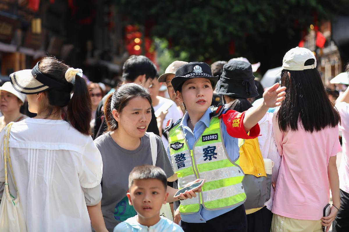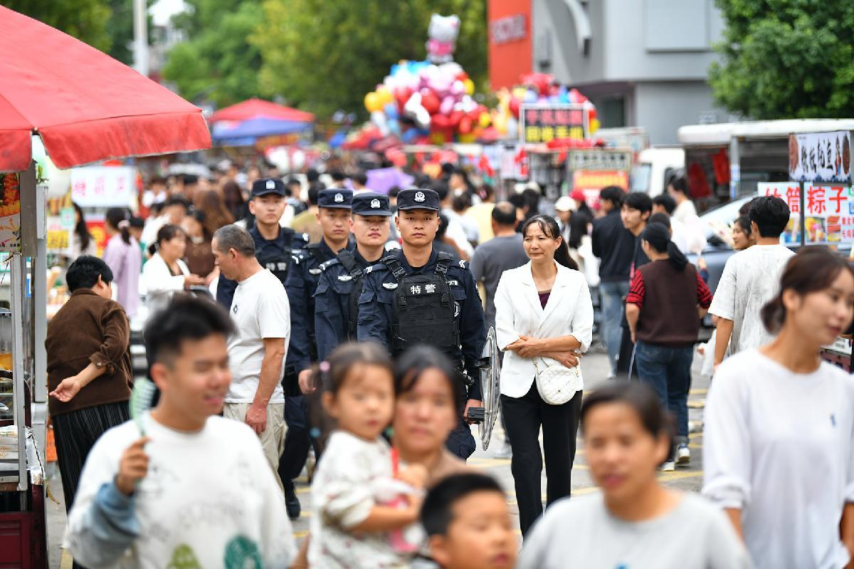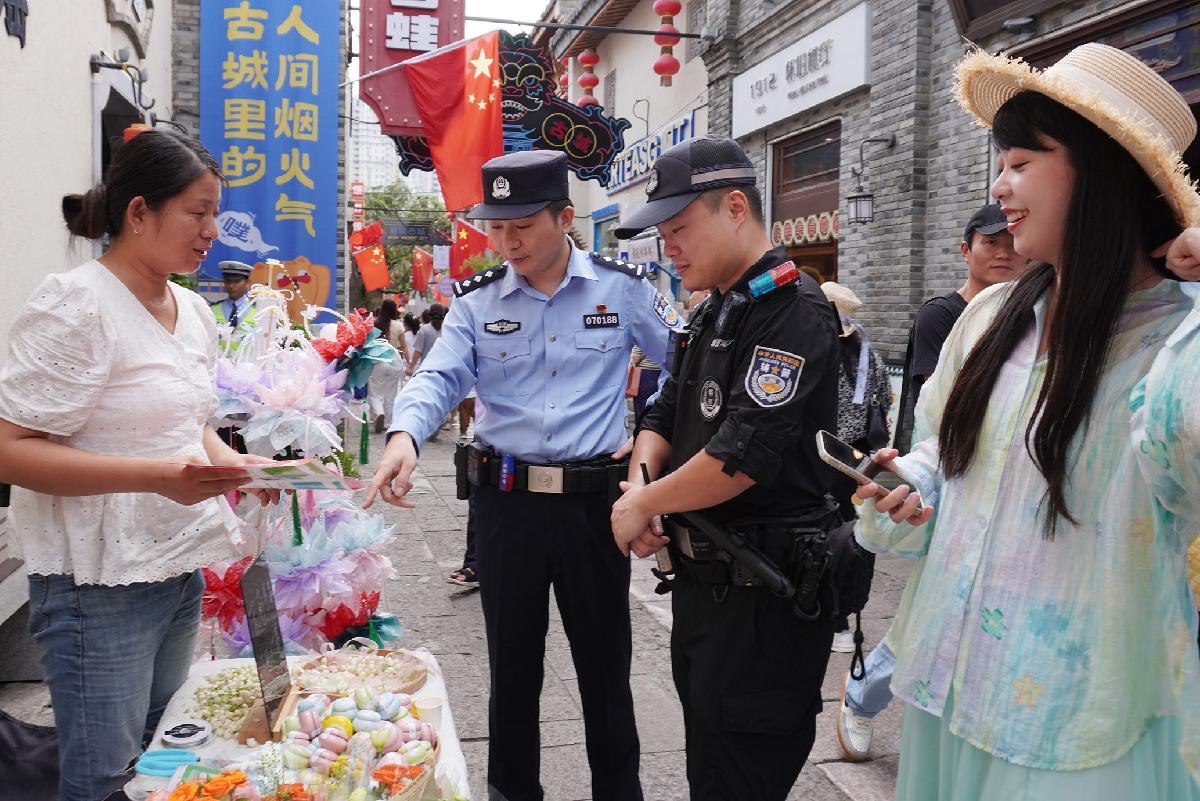 10月1日,安徽省蕪湖市公安局鏡湖分局民輔警在古城景區(qū)巡邏執(zhí)勤,并向游客進行反電詐宣傳。